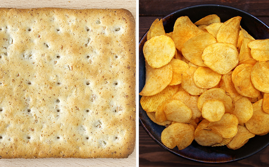 Ενώ και τα δύο είδη έχουν περίπου τις ίδιες θερμίδες και αλάτι, τα κράκερ συχνά περιέχουν περισσότερο λίπος και ζάχαρη.