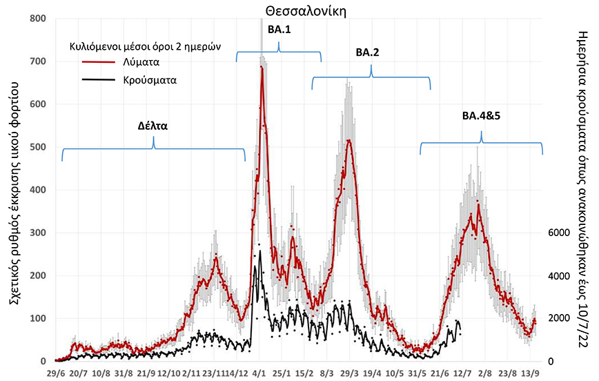 Επιτάχυνση του ρυθμού αύξησης της συγκέντρωσης του ιικού φορτίου του κορονοϊού στα αστικά απόβλητα της Θεσσαλονίκης, που αποδίδεται στην επικράτηση των υποπαραλλαγών ΒΑ4&5 του SARS-CoV-2, καθώς η παραλλαγή «Κένταυρος» (ΒΑ.2.75) δεν ανιχνεύεται ακόμη, δείχνουν οι πιο πρόσφατες μετρήσεις για την έρευνα, που διεξάγει η Ομάδα Επιδημιολογίας Λυμάτων του ΑΠΘ με την ΕΥΑΘ, σε συνεργασία με την Περιφέρεια Κεντρικής Μακεδονίας και στο πλαίσιο του Εθνικού Δικτύου του ΕΟΔΥ.