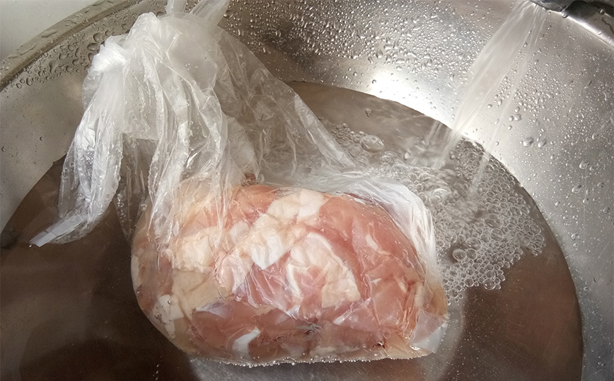 Γεμίστε ένα μεγάλο μπολ ή το νεροχύτη της κουζίνας σας με κρύο νερό. Βυθίστε το κοτόπουλο σε σακούλα. Αλλάζετε το νερό κάθε 30 λεπτά.