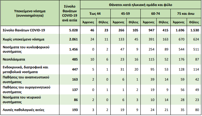- Οι θάνατοι από τη νόσο COVID-19 ανήλθαν σε 5.0282 (2.955 άνδρες και 2.073 γυναίκες) κατά το 2020. Οι περισσότεροι θάνατοι καταγράφηκαν στην ηλικιακή ομάδα άνω των 75 ετών (3.226 θάνατοι) και ακολουθούν οι ηλιακές ομάδες 60-74 ετών και 45-59 ετών με 1.362 και 371 θανάτους, αντίστοιχα. Στην ηλικιακή ομάδα έως 15 ετών δεν καταγράφηκαν θάνατοι από τη νόσο. Η νόσος COVID-19 ήταν η μόνη αιτία θανάτου, όπως αναφέρθηκε στα πιστοποιητικά θανάτου, σε ποσοστό 41,0% των θανάτων από COVID-19 (2.061 θάνατοι), ενώ για το 59,0% (2.967 θάνατοι) υπήρχε αναφορά σε υποκείμενο νόσημα (συννοσηρότητα). Τα κυριότερα υποκείμενα νοσήματα των θανόντων από τη νόσο COVID-19 ήταν τα νοσήματα του κυκλοφορικού συστήματος, τα νεοπλάσματα και τα ενδοκρινικά, διατροφικά και μεταβολικά νοσήματα, με ποσοστά 29,0% (1.456 θάνατοι), 9,6% (485 θάνατοι) και 8,9% (447 θάνατοι), αντίστοιχα.