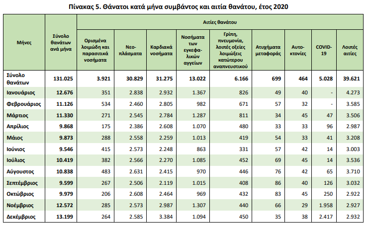 Στον παρακάτω πίνακα θα δείτε τα αίτια θανάτου για το 2020