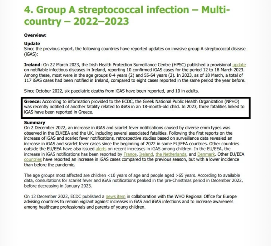 Το Ευρωπαϊκό Κέντρο Ελέγχου και Πρόληψης Νοσημάτων (ECDC) έδωσε στη δημοσιότητα μια νέα επιδημιολογική έκθεση και σημειώνει ότι τρία παιδιά πέθαναν από στρεπτόκοκκο Α στην Ελλάδα το φετινό έτος.