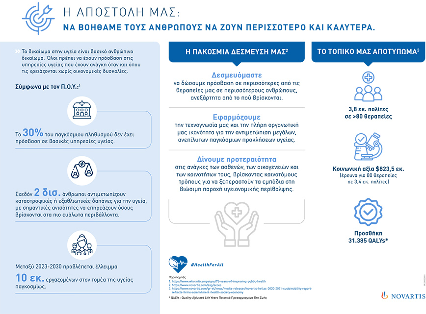 Το 2021 3,4 εκατ. Έλληνες πολίτες είχαν πρόσβαση σε 80 θεραπείες με 31.385 Ποιοτικά Προσαρμοσμένα Έτη Ζωής (QALYs). Η κοινωνική/πολλαπλασιαστική αξία των θεραπειών αυτών – μέσω της συνεισφοράς του υγιούς πληθυσμού στο Α.Ε.Π. της χώρας – ανήλθε σε $823,5 εκ. Επιπλέον, την ίδια χρονιά, η Novartis Hellas πραγματοποίησε 72 κλινικές μελέτες ύψους άνω των 7 εκατ. ευρώ, με 718 συμμετέχοντες, καθώς και 6 προγράμματα υποστήριξης ασθενών/πρόσβασης με 2.901 ωφελούμενους.