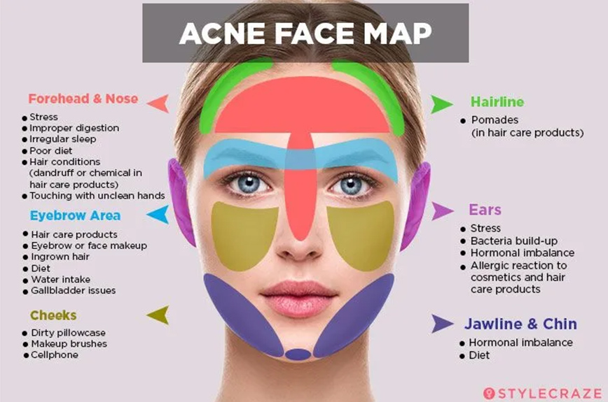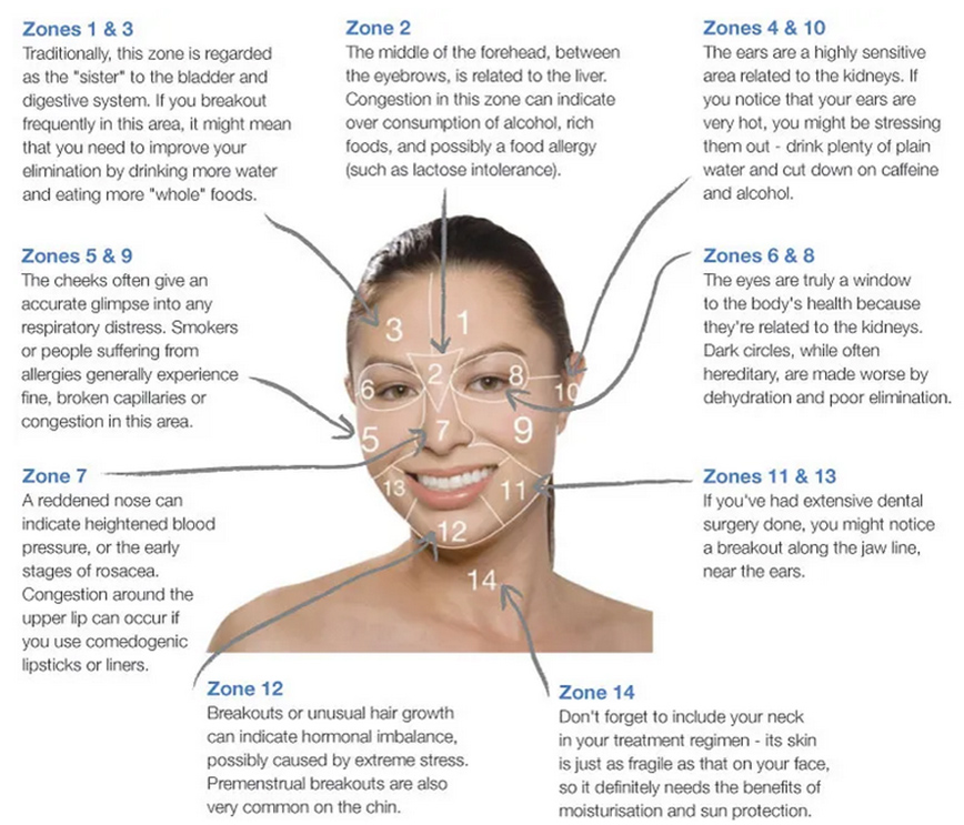 Η χαρτογράφηση προσώπου ακμής πιστεύει ότι εάν μελετήσετε πού εμφανίζονται τα ξέσπασμά σας, μπορείτε να βρείτε το έναυσμα. Και μόλις μάθετε το έναυσμα, θα μπορούσατε να βάλετε ένα τέλος στα σπυράκια σας. Αυτή η τεχνική, όπως και οι άλλες, χωρίζει το πρόσωπο σε ζώνες που αντιστοιχούν σε ένα συγκεκριμένο ιατρικό πρόβλημα ή πρόβλημα τρόπου ζωής. Εδώ είναι πώς υποτίθεται ότι λειτουργεί.