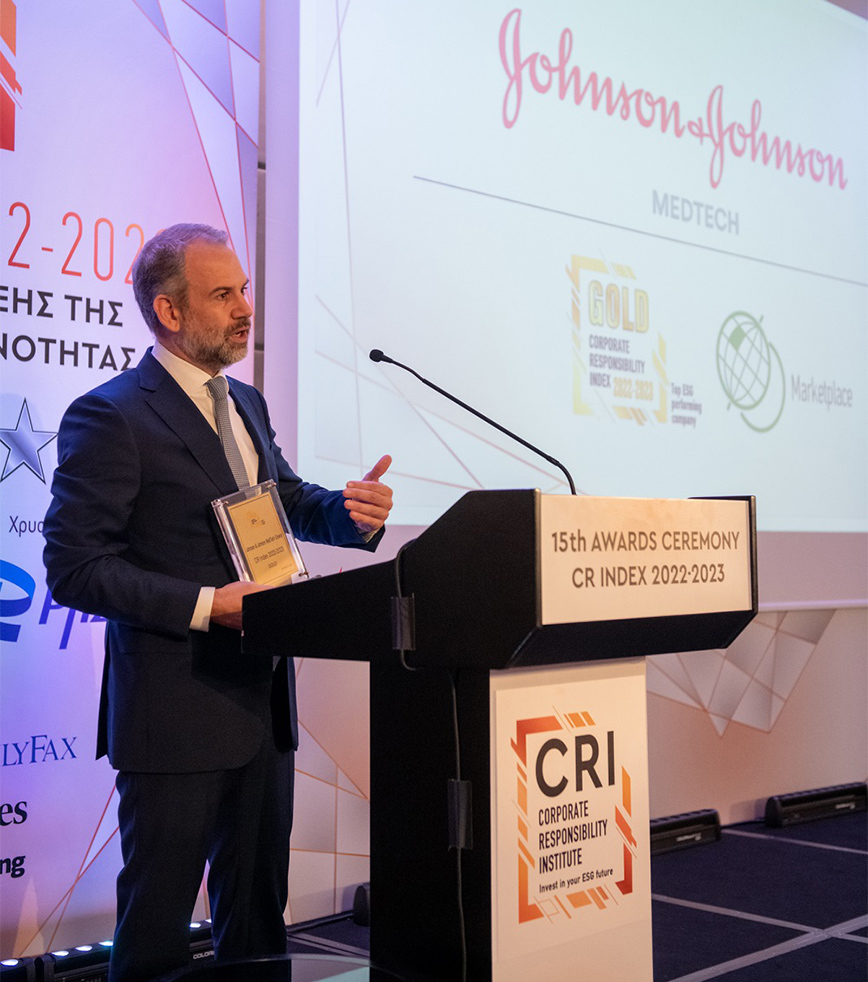 Διπλή διάκριση απέσπασε η Johnson & Johnson MedTech Ελλάδας στον Εθνικό Δείκτη Εταιρικής Υπευθυνότητας CR Index 2023 και το CRI Pass του Ινστιτούτου Εταιρικής Ευθύνης για δεύτερη συνεχή χρονιά. Η Johnson & Johnson MedTech Ελλάδας τιμήθηκε με το Χρυσό Βραβείο (Gold Award), καθώς και με τον Έπαινο Best in Marketplace, για την πρόοδο της αναφορικά με τις πρακτικές βιώσιμης ανάπτυξης και τα κριτήρια ESG που εφαρμόζει διαχρονικά μέσα από ένα διεθνώς αναγνωρισμένο εργαλείο αξιολόγησης των επιδόσεων της.