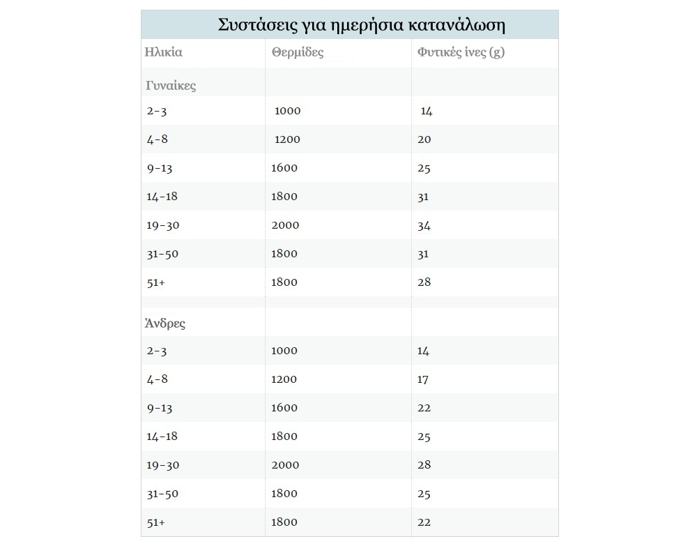 Για τις ενήλικες γυναίκες συνίσταται -κατά μέσο όρο- να λαμβάνουν 22 έως 28 γραμμάρια φυτικών ινών ημερησίως, ενώ οι ενήλικες άνδρες 28 έως 34 γραμμάρια. Αναλυτικά οι συνιστώμενες ποσότητες ανά φύλο και ηλικία.