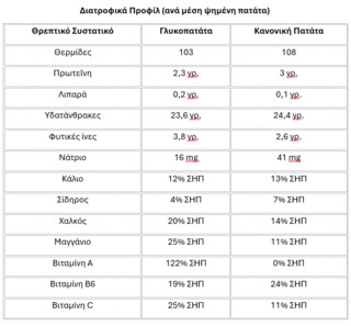 Ωστόσο, από διατροφικής άποψης, οι γλυκοπατάτες έχουν ένα μικρό προβάδισμα. Αυτό οφείλεται κυρίως στο ότι περιέχουν βιταμίνη Α και έχουν ελαφρώς υψηλότερη περιεκτικότητα σε φυτικές ίνες, βιταμίνη C, χαλκό και μαγγάνιο.