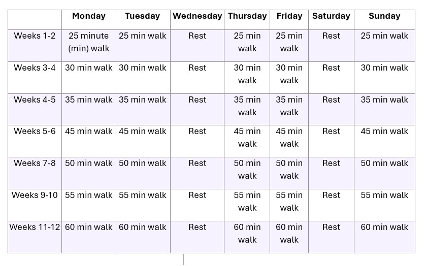 Αν ξεκινάτε τώρα και δεν είχατε την άσκηση στο πρόγραμμά σας, συμβουλευτείτε πρώτα γιατρό. Ξεκινήστε με 25 λεπτά: 5 λεπτά χαλαρό περπάτημα, 15 λεπτά με πιο γρήγορο ρυθμό και ξανά 5 λεπτά χαλαρά. Επαναλάβετε 5 φορές την εβδομάδα. Κάθε δύο εβδομάδες, αυξήστε τη διάρκεια της έντονης φάσης κατά 5 λεπτά, μέχρι να φτάσετε τα 30-40 λεπτά.