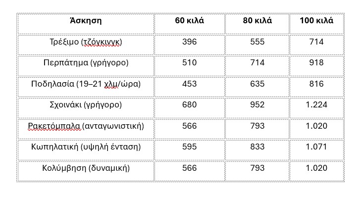 Ωστόσο, για μια γενική σύγκριση, δείτε το ακόλουθο διάγραμμα θερμίδων που καίγονται κατά τη διάρκεια μιας ώρας διαφορετικών τύπων άσκησης, για τρία διαφορετικά σωματικά βάρη…