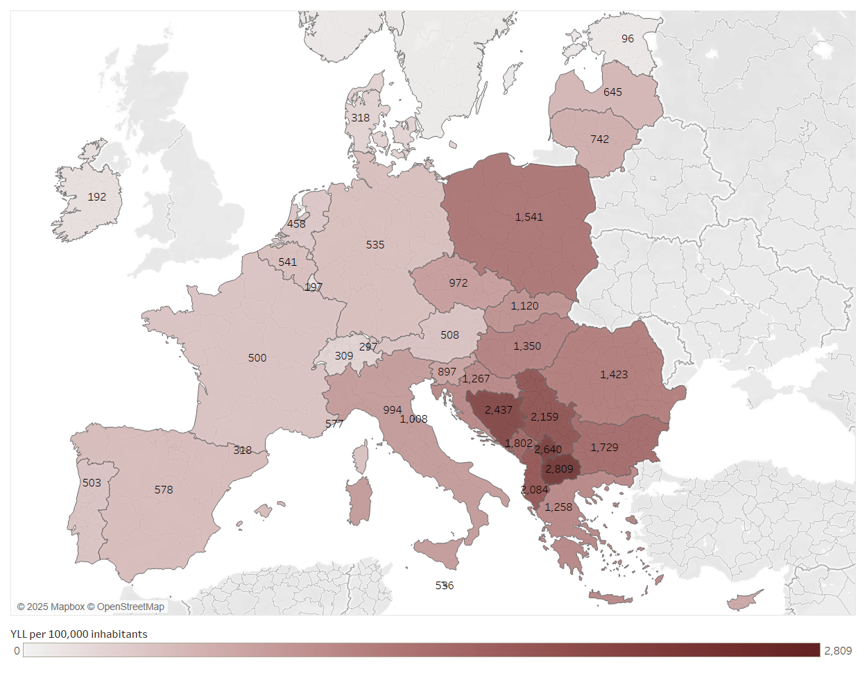 Οι υψηλότεροι δείκτες θνησιμότητας λόγω PM2.5 καταγράφονται στην Κεντρική και Ανατολική Ευρώπη. Μεταξύ άλλων και στην Ελλάδα, όπου καταγράφονται 95 θάνατοι ανά 100.000. Σε απόλυτο αριθμό εκτιμάται πως τα θύματα της ατμοσφαιρικής ρύπανσης στη χώρα μας ανέρχονται σε 1.258 λόγω PM2.5 και σε 261 λόγω NO2.