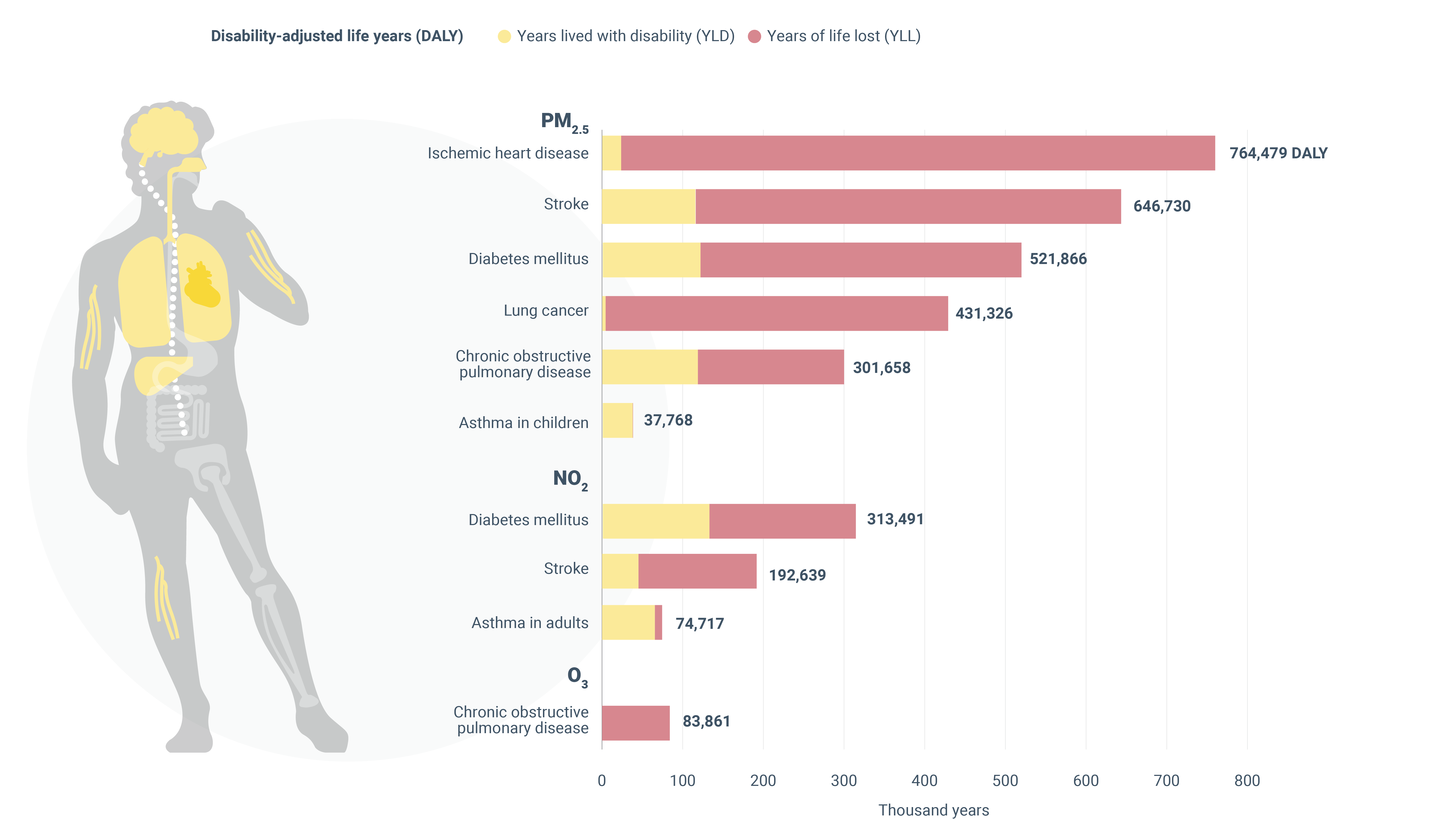 Σύμφωνα τα τελευταία επίσημα στοιχεία της Ευρωπαϊκής Υπηρεσίας Περιβάλλοντος (EEA), τα αιωρούμενα μικροσωματίδια (PM2.5) ευθύνονται για περίπου 239.000 θανάτους το 2022, ενώ άλλοι 48.000 άνθρωποι έχασαν τη ζωή τους εξαιτίας της έκθεσης σε διοξείδιο του αζώτου (NO2).