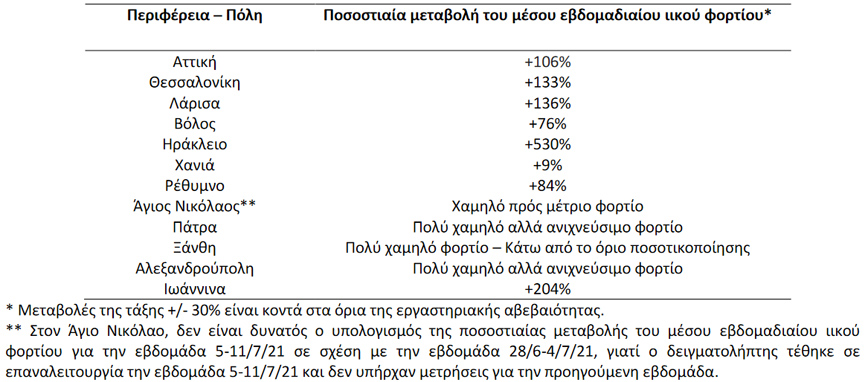 - Περιφέρεια Αττικής: Την τελευταία εβδομάδα, 5-11/7/21, το ιικό φορτίο στα λύματα της Περιφέρειας Αττικής παρουσίασε στατιστικά σημαντική αύξηση (+106%) του εβδομαδιαίου μέσου όρου σε σχέση με την προηγούμενη εβδομάδα, 28/6-04/7/21.