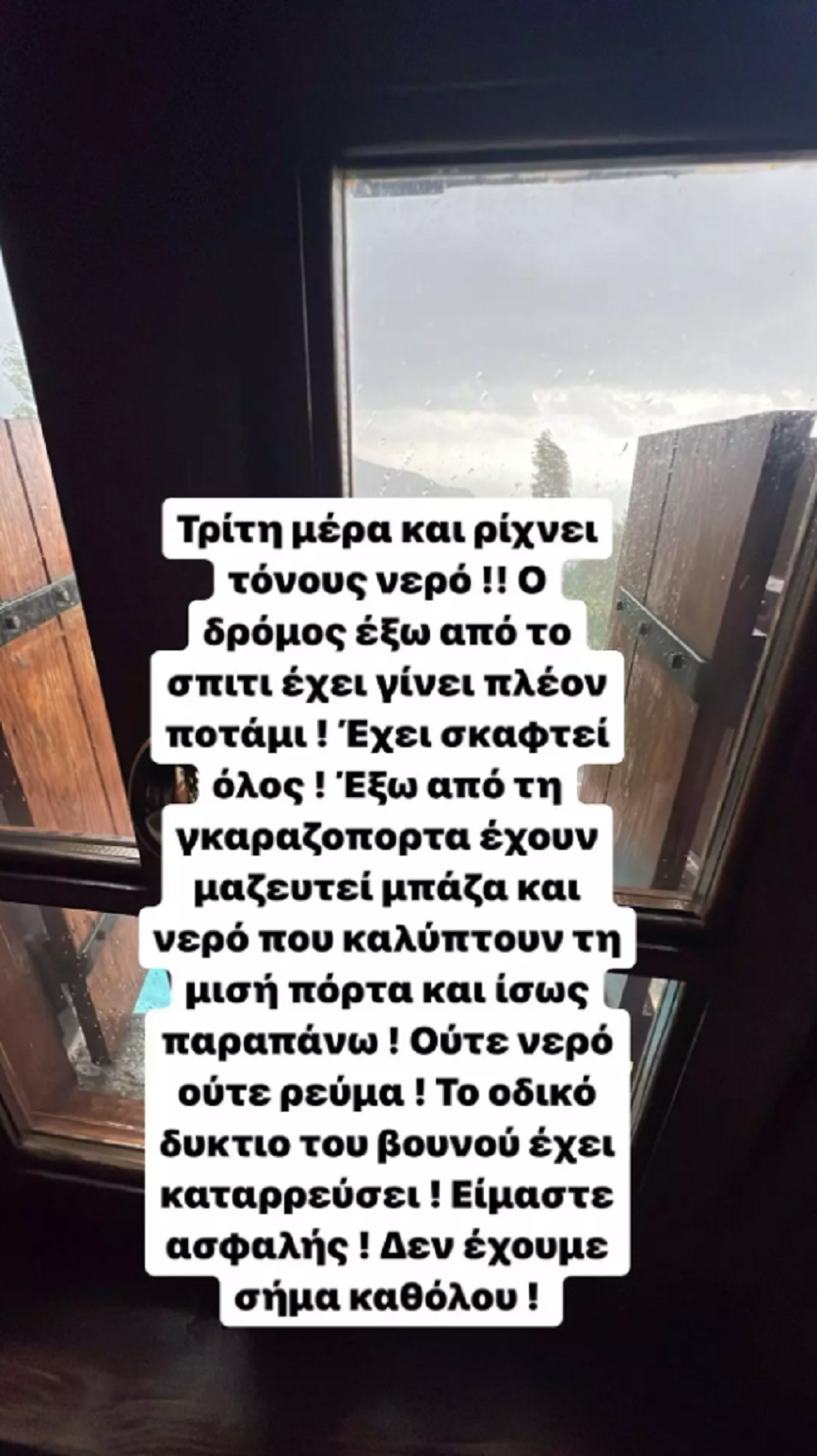«Τρίτη μέρα και ρίχνει τόνους νερό!! Ο δρόμος έξω από το σπίτι έχει γίνει πλέον ποτάμι. Έχει σκαφτεί όλος. Έξω από τη γκαραζόπορτα έχουν μαζευτεί μπάζα και νερό που καλύπτουν τη μισή πόρτα και ίσως παραπάνω. Ούτε νερό, ούτε ρεύμα. Το οδικό δίκτυο του βουνού έχει καταρρεύσει. Είμαστε ασφαλείς. Δεν έχουμε σήμα καθόλου!».