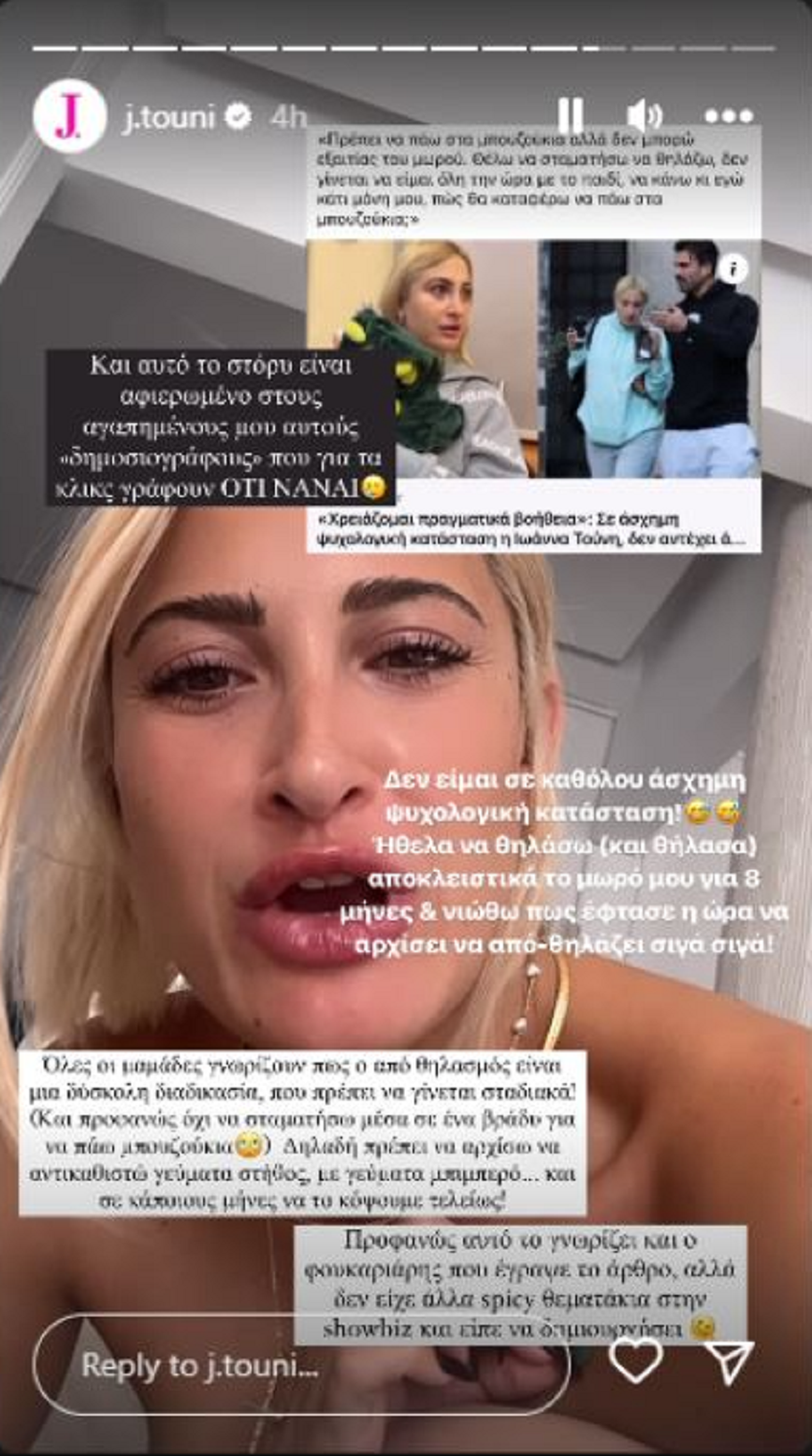 Η influencer έκανε story στο Instagram και έγραψε πως «και αυτό το Story είναι αφιερωμένο στους αγαπημένους μου αυτούς “δημοσιογράφους” που για τα κλικς γράφουν ό,τι να ναι. Δεν είμαι σε καθόλου άσχημη ψυχολογική κατάσταση! Ήθελα να θηλάσω και θήλασα αποκλειστικά το μωρό μου για οκτώ μήνες και νιώθω πως έφτασε η ώρα να αρχίζει να αποθηλάζει σιγά σιγά».