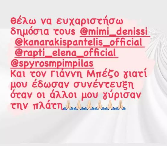 «Θέλω να ευχαριστήσω δημόσια τους: Μιμή Ντενίση, Παντελή Καναράκη, Έλενα Ράπτη, Σπύρο Μπιμπίλα και τον Γιάννη Μπέζο, γιατί μου έδωσαν συνέντευξη όταν οι άλλοι μου γύρισαν την πλάτη», έγραψε χαρακτηριστικά.