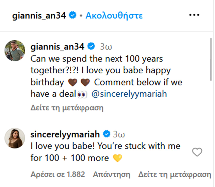 Στη λεζάντα της φωτογραφίας του, ο Γιάννης Αντετοκούνμπο έγραψε: «Μπορούμε να περάσουμε τα επόμενα 100 χρόνια μαζί; Σ’ αγαπώ μωρό μου χρόνια πολλά. Σχολίασε παρακάτω αν έχουμε συμφωνία». Εκείνη δεν έχασε χρόνο και του έγραψε αμέσως: «Σ’ αγαπώ μωρό μου! Είσαι κολλημένος μαζί μου για 100 + 100 ακόμα».