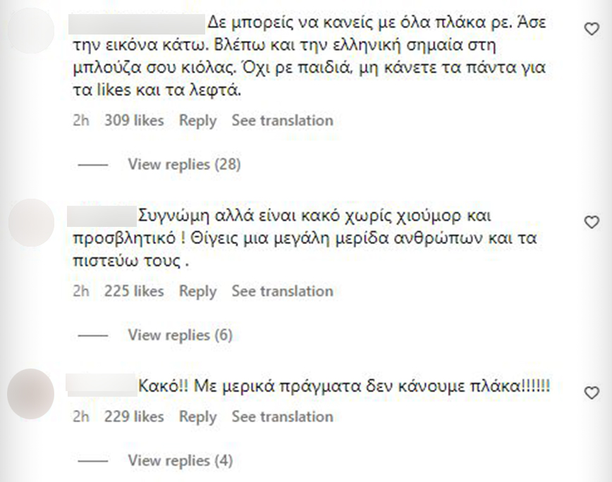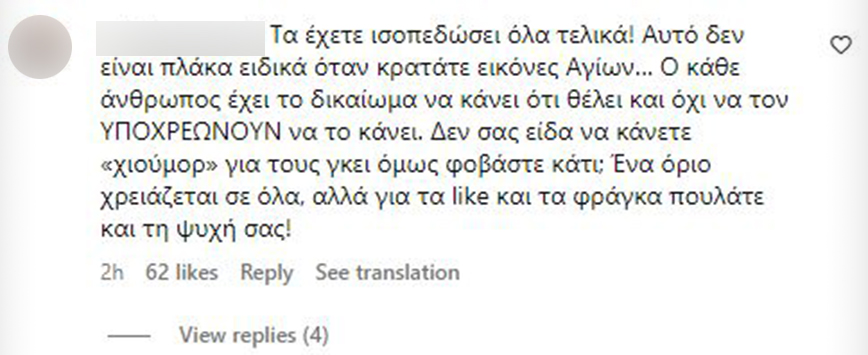 - «Τα έχετε ισοπεδώσει όλα τελικά! Αυτό δεν είναι πλάκα ειδικά όταν κρατάτε εικόνες Αγίων… Ο κάθε άνθρωπος έχει το δικαίωμα να κάνει ότι θέλει και όχι να τον ΥΠΟΧΡΕΩΝΟΥΝ να το κάνει. Δεν σας είδα να κάνετε «χιούμορ» για τους γκει όμως φοβάστε κάτι; Ένα όριο χρειάζεται σε όλα, αλλά για τα like και τα φράγκα πουλάτε και τη ψυχή σας»