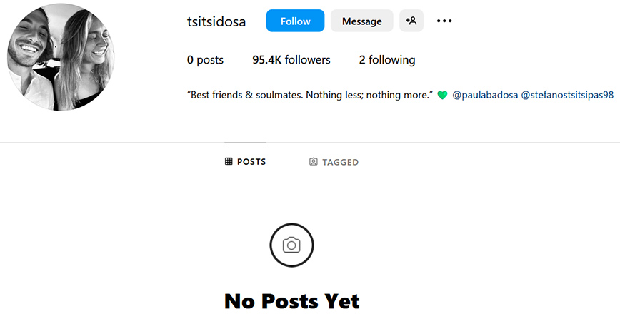 Όλες οι φωτογραφίες από τον κοινό λογαριασμό του Στέφανου Τσιτσιπά και της Πάουλα Μπαντόσα στο Instagram (tsitsidosa) εξαφανίστηκαν με αποτέλεσμα να ξεκινήσει η συζήτηση για χωρισμό του ζευγαριού.