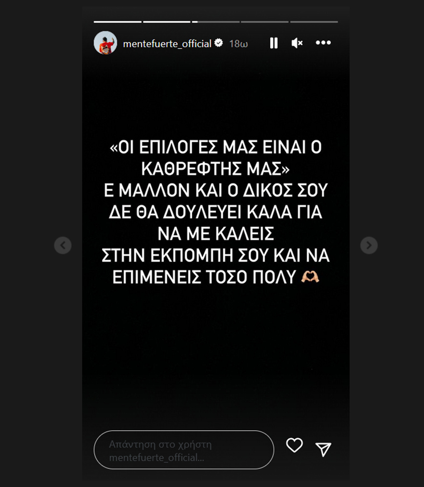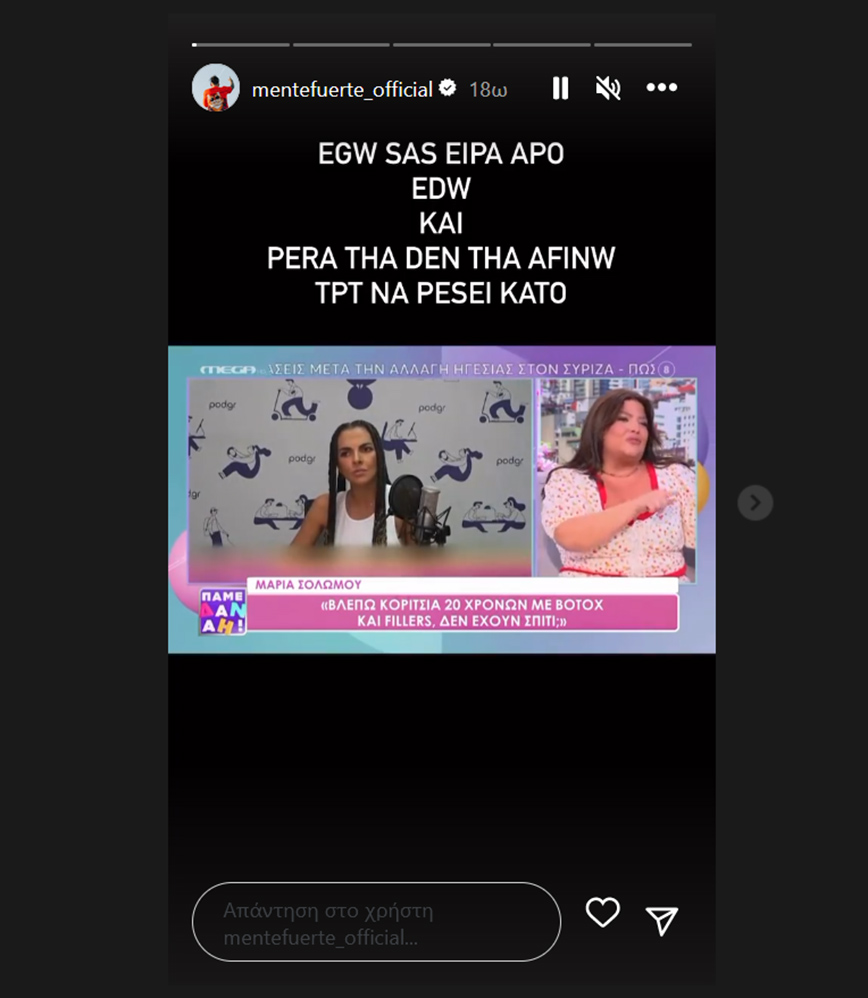 Δημοσιεύοντας διάφορα stories στον προσωπικό του λογαριασμό στο Instagram, ο Mente Fuerte υπερασπίστηκε τη Μαρία Σολωμού, ρίχνοντας τα βέλη του κατά της Δανάης Μπάρκα. Ανεβάζοντας σε βίντεο το απόσπασμα που μιλάει η παρουσιάστρια, ο Mente Fuerte έγραψε, αρχικά: «Εγώ σας είπα, από εδώ και πέρα δεν θα αφήνω τίποτα να πέσει κάτω. Οι απόψεις είναι σαν τις κ……..ς, όλοι έχουμε μια. Έχουμε και εμείς στοματάκι, απλώς δεν το ανοίγουμε χωρίς λόγο».
