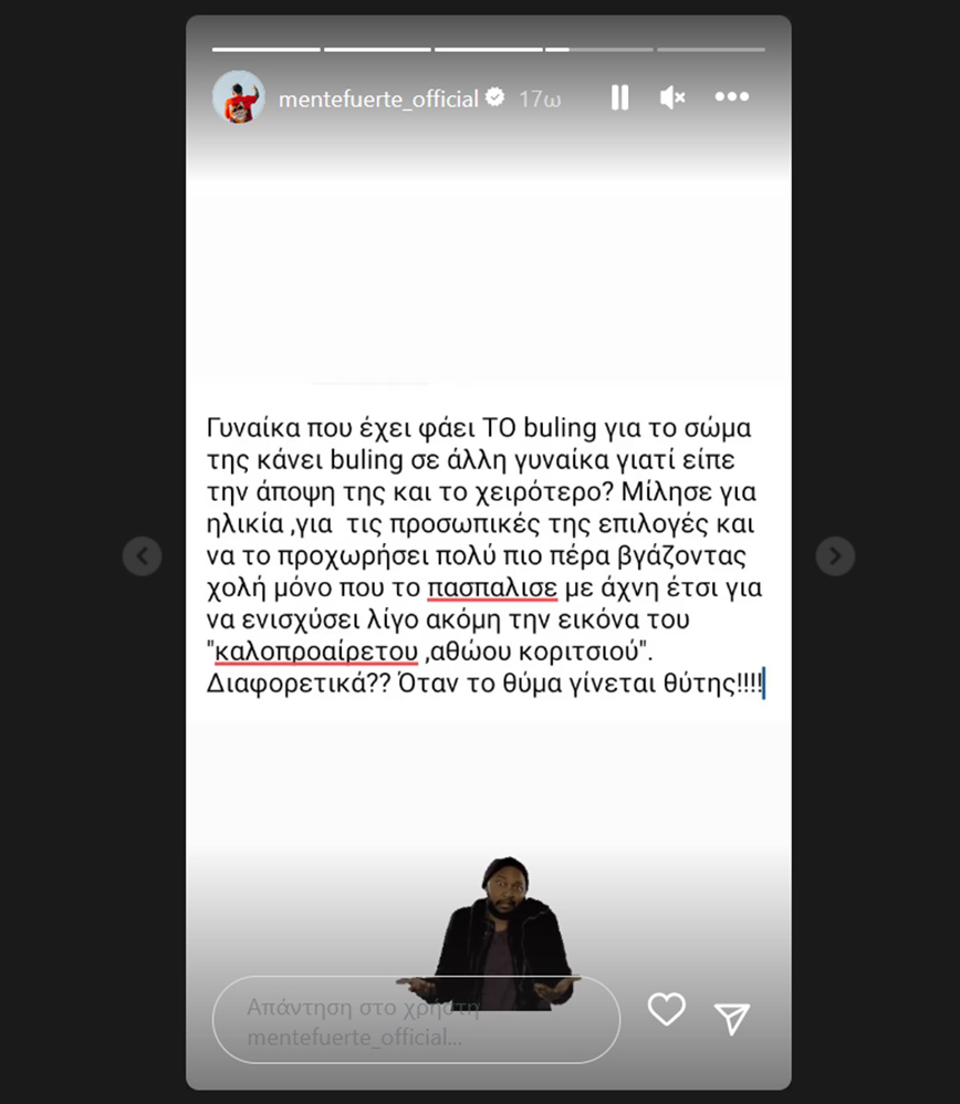 «’’Οι επιλογές μας είναι ο καθρέφτης μας’’, μάλλον ο δικός σου δεν θα δουλεύει καλά για να με καλείς στην εκπομπή σου και να επιμένεις τόσο πολύ», έγραψε ο ίδιος, ενώ στη συνέχεια αναδημοσίευσε ένα σχόλιο που έγραφε: «Γυναίκα που έχει φάει ΤΟ bullying για το σώμα της, κάνει bullying σε άλλη γυναίκα γιατί είπε την άποψή της, και το χειρότερο; Μίλησε για ηλικία, για τις προσωπικές της επιλογές και να το προχωρήσει πολύ πιο πέρα, βγάζοντας χολή, μόνο που το πασπάλισε με άχνη, έτσι, για να ενισχύσει λίγο ακόμη την εικόνα του ‘’καλοπροαίρετου, αθώου κοριτσιού’’. Διαφορετικά; Όταν το θύμα, γίνεται θύτης».