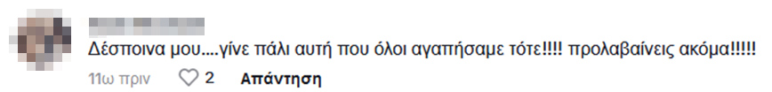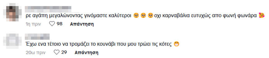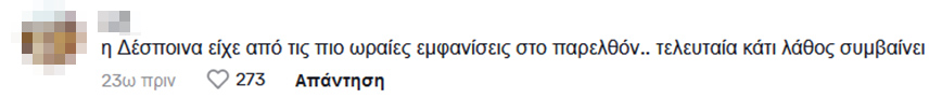 Κάποια από τα βιτριολικά σχόλια που μάζεψε το βίντεο της Δέσποινας Βανδή στο TikTok, ανέφεραν πως «πρέπει να αλλάξει στιλίστα σύντομα», «μεγαλώνοντας γινόμαστε καλύτεροι, όχι καρναβάλια». Ένας άλλος χρήστης έγραψε: «Δέσποινα, γίνε πάλι αυτή που αγαπήσαμε».