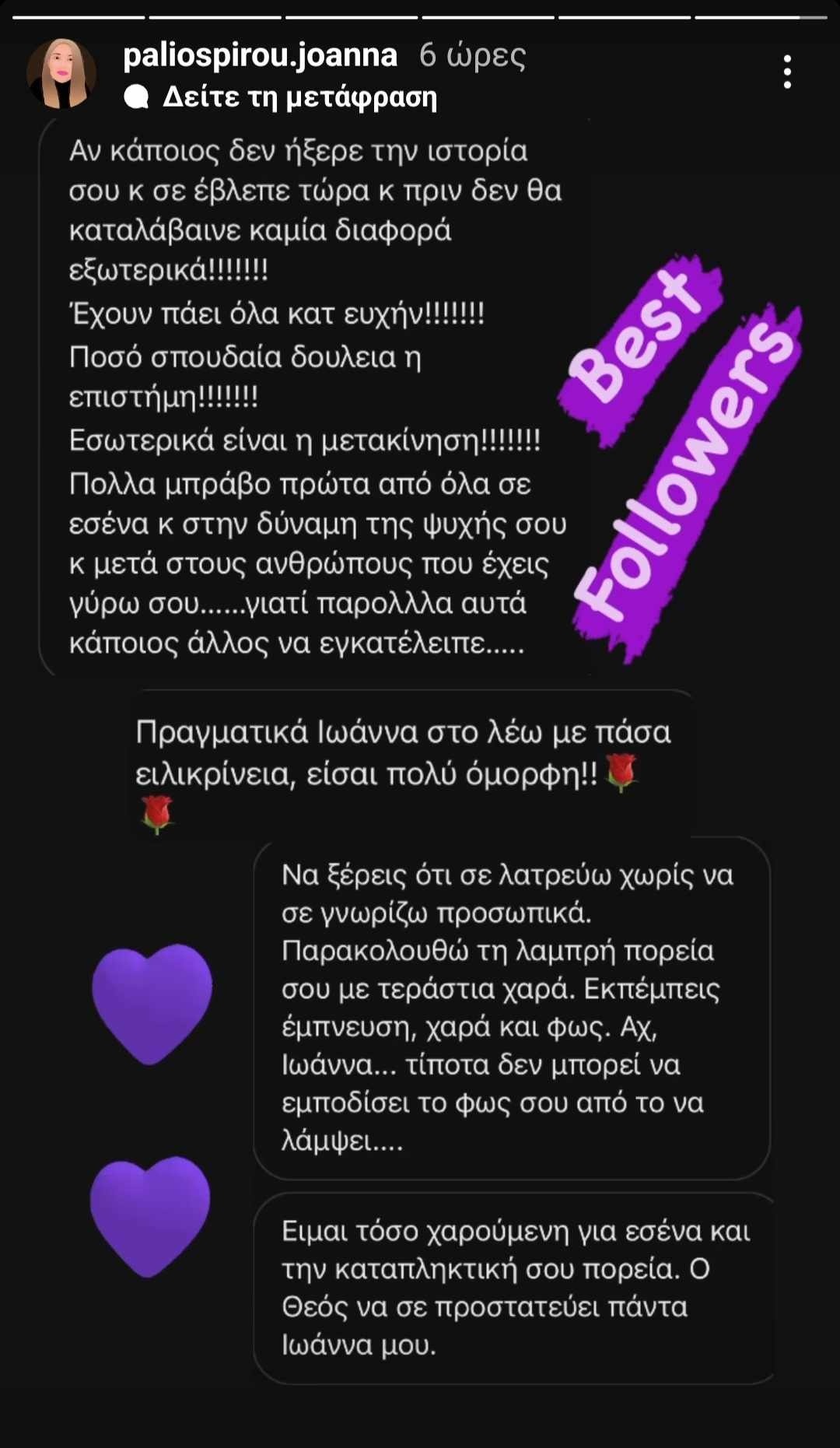 «Είσαι μια κούκλα Ιωάννα, με το χαμόγελο, την εσωτερική δύναμη, την θέληση, την καρδιά και την ψυχή σου άλλαξε την ιστορία. Είσαι η πραγματική απόδειξη του ρητού που λέει “όταν θέλεις, μπορείς”».