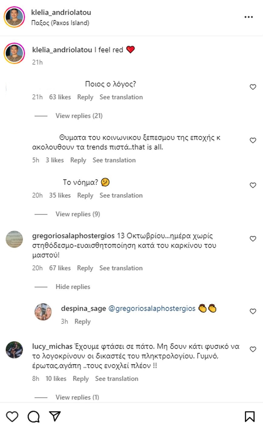 Στη λεζάντα της ανάρτησής της, η Κλέλια Ανδριολάτου έγραψε: «Νιώθω κόκκινη».