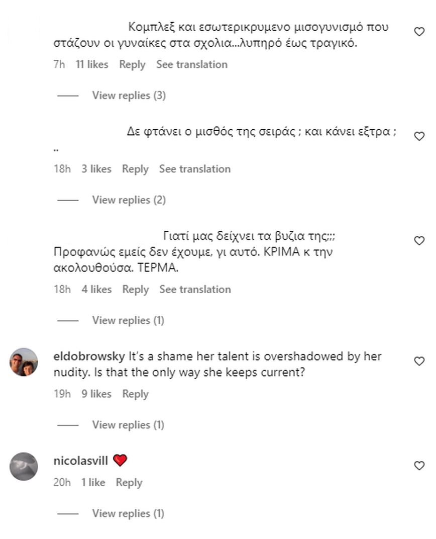 Η συγκεκριμένη ανάρτηση προκάλεσε διχασμό στους διαδικτυακούς της φίλους αφού ορισμένοι σχολίασαν πως δεν καταλαβαίνουν το λόγο που ηθοποιός «ανέβασε» τα στιγμιότυπα αυτά, ενώ ορισμένοι έσπευσαν να σχολιάσουν πως ο λόγος της δημοσίευσης ήταν η 13η Οκτωβρίου, ημέρα που έχει χαρακτηριστεί ως ημέρα χωρίς στηθόδεσμο με στόχο την ευαισθητοποίηση κατά του καρκίνου του μαστού.
