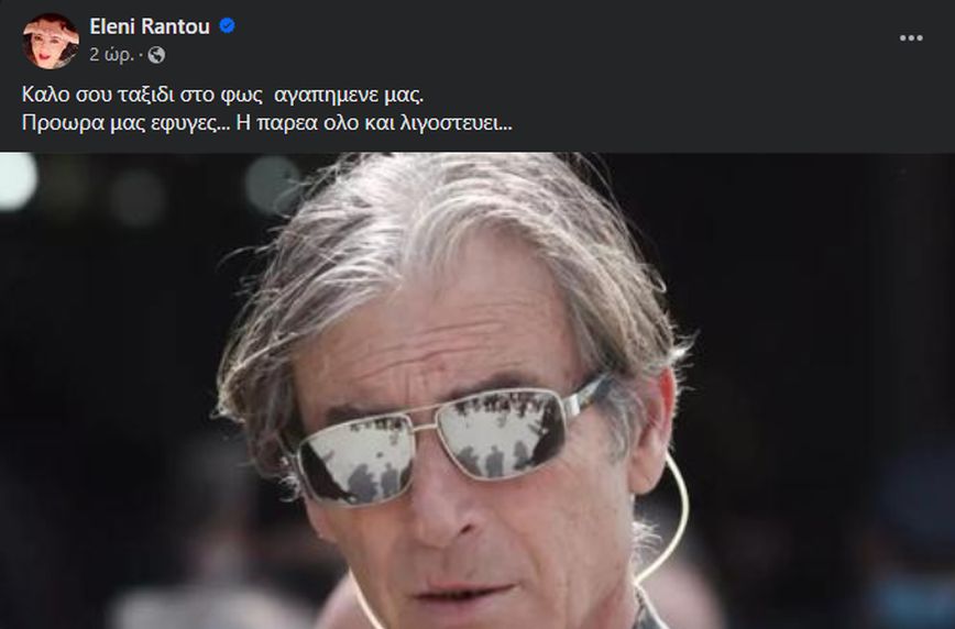 «Καλό σου ταξίδι στο φως, αγαπημένε μας. Πρόωρα μας έφυγες… Η παρέα όλο και λιγοστεύει…», έγραψε η Ελένη Ράντου στο αποχαιρετιστήριο μήνυμά της.