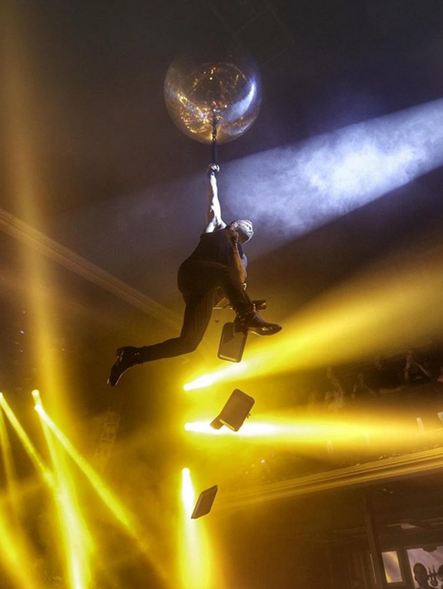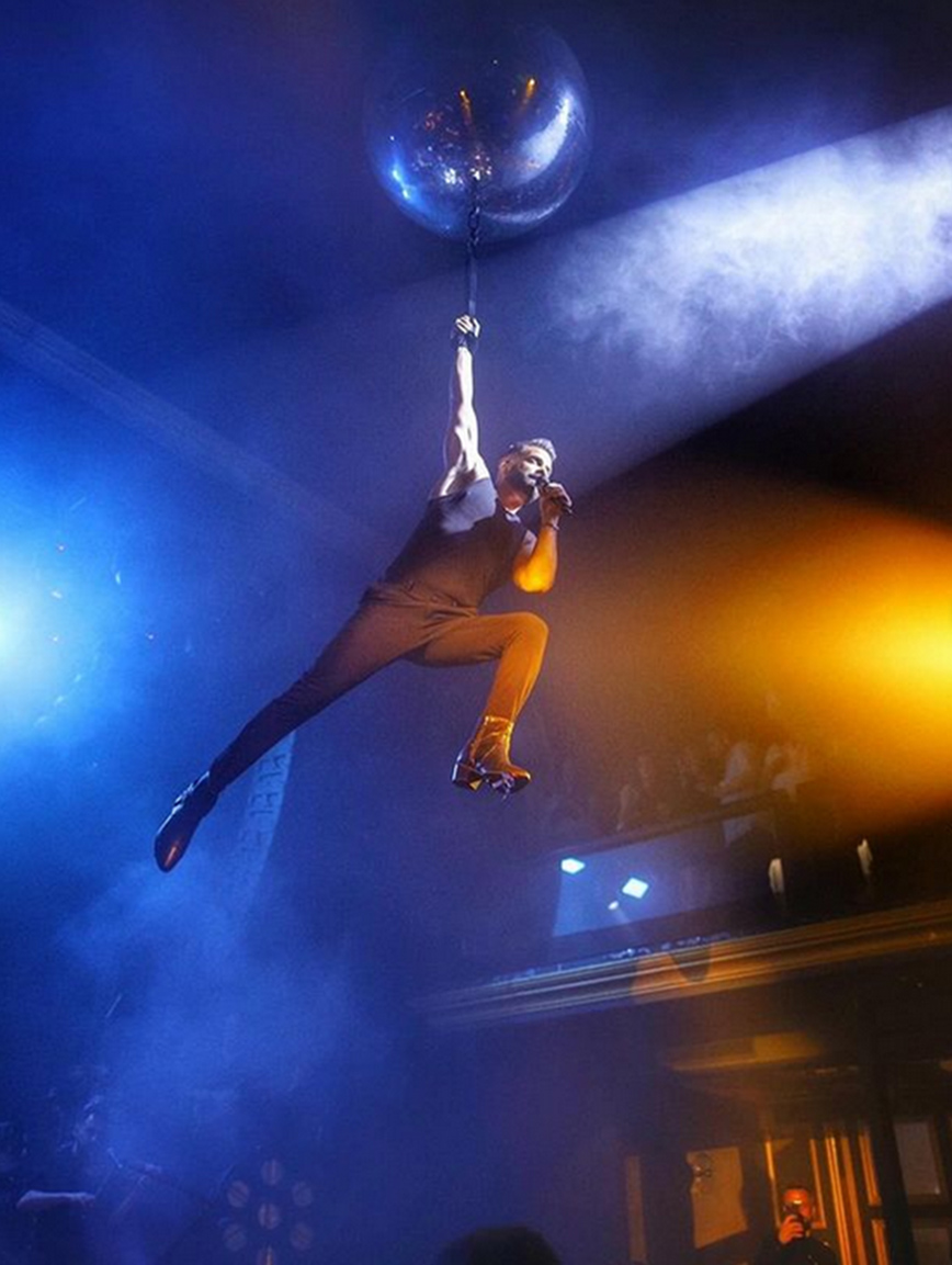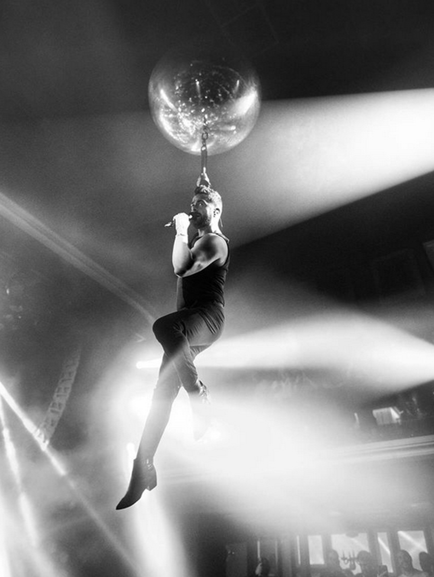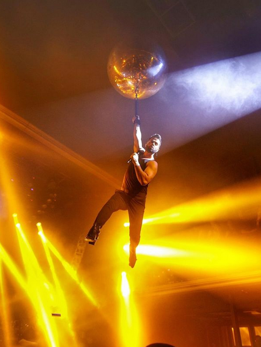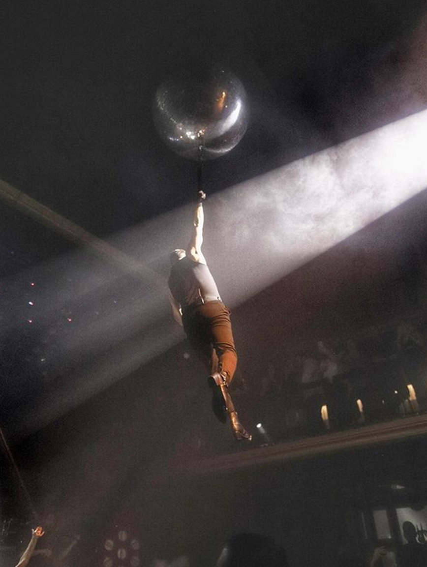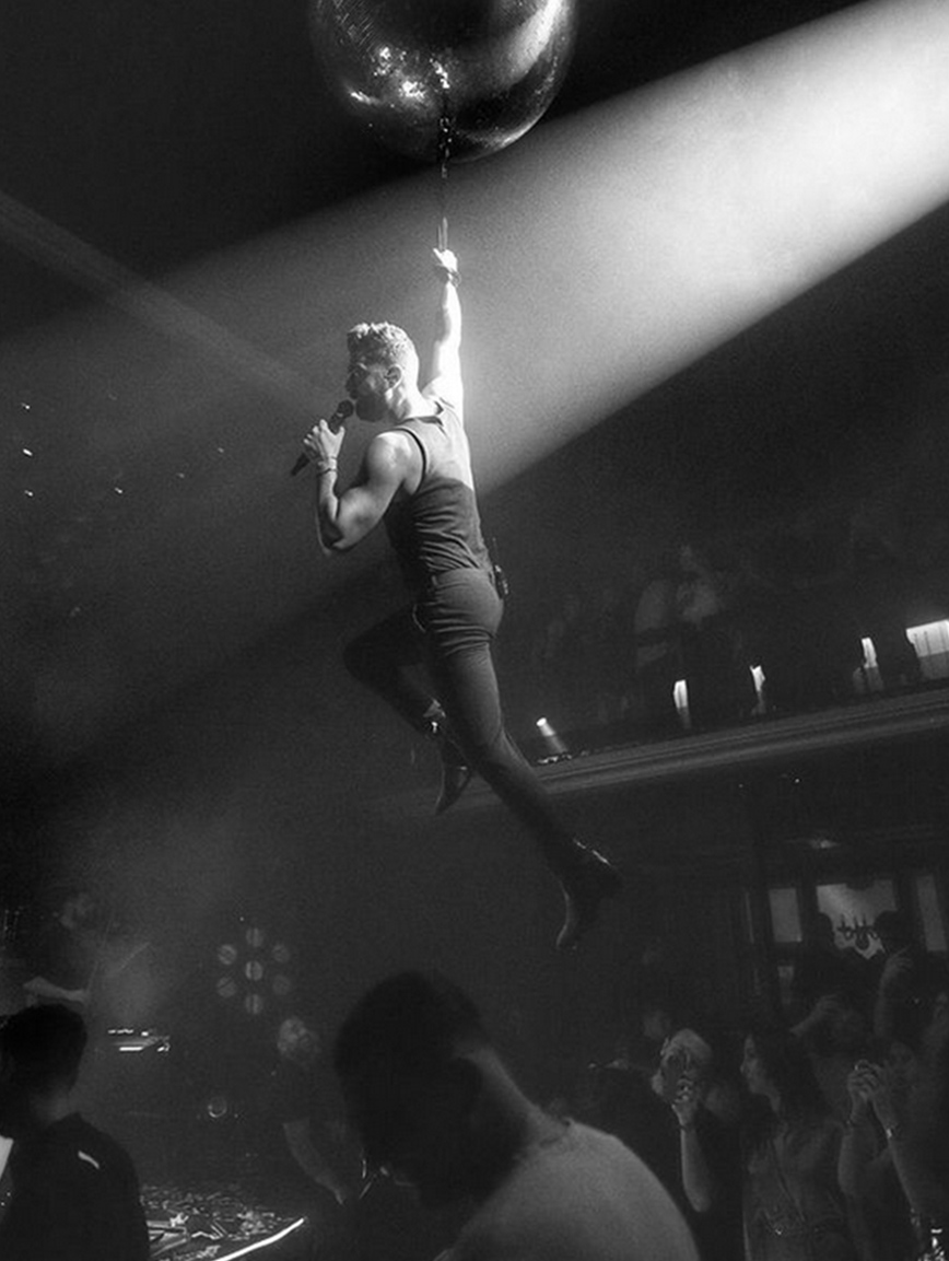 Ο Ηλίας Βρεττός φαίνεται τραγουδά από ψηλά και με το χέρι του να κρατάει τον γάντζο μιας μεγάλης ασημένιας μπάλας που έχει τοποθετηθεί στο ταβάνι.