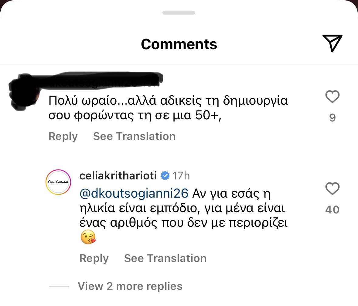 Μάλιστα η Σίλια Κριθαριώτη, σε ανάρτησή της στο Instagram, αναφέρθηκε λεπτομερώς στην πρεμιέρα της Δέσποινας Βανδή και δημοσίευσε μια σειρά από στιγμιότυπα. Ωστόσο, μια ακόλουθός της δεν δίστασε να κάνει ένα προσβλητικό και αγενές σχόλιο λέγοντάς της χαρακτηριστικά: «Πολύ ωραίο, αλλά αδικείς τη δημιουργία σου φορώντας τη σε μια 50+».