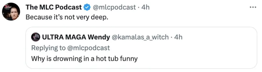 «Πνίγηκε σε τζακούζι. Χαχαχαχα» έγραψε αρχικά η Μπρέναν στο X. Στην ερώτηση «Γιατί είναι αστείο να πνίγεσαι σε ένα τζακούζι;», ο Μπρέναν απάντησε: «Επειδή δεν είναι πολύ βαθύ».