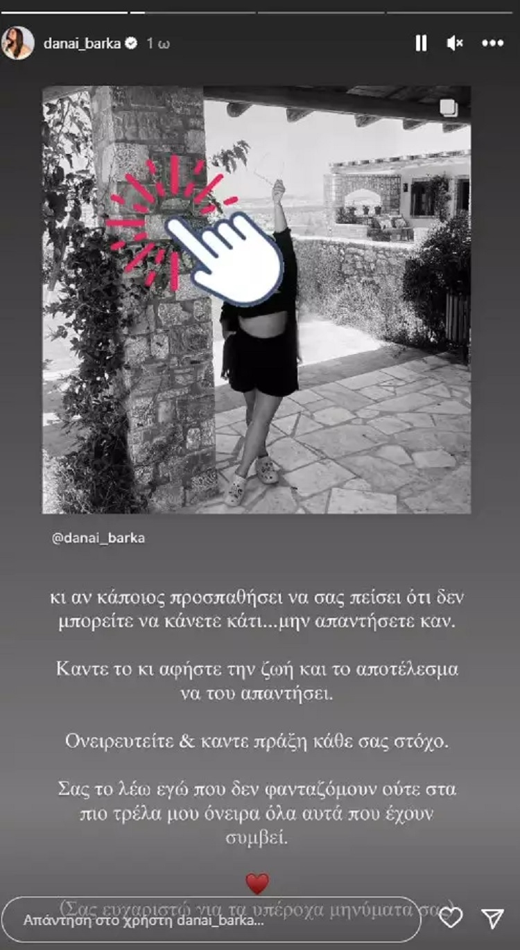 Η παρουσιάστρια της τηλεοπτικής εκπομπής «Πάμε Δανάη» που μεταδίδεται καθημερινά από τη συχνότητα του Mega, έγραψε αρχικά σε story της στην πλατφόρμα μέσων κοινωνικής δικτύωσης: «Αν κάποιος προσπαθήσει να σας πείσει ότι δεν μπορείτε να κάνετε κάτι, μην απαντήσετε καν. Κάντε το κι αφήστε την ζωή και το αποτέλεσμα να του απαντήσει. Ονειρευτείτε και κάντε πράξη κάθε σας στόχο. Σας λέω εγώ που δεν φανταζόμουν ούτε στα πιο τρελά μου όνειρα όλα αυτά που έχουν συμβεί».