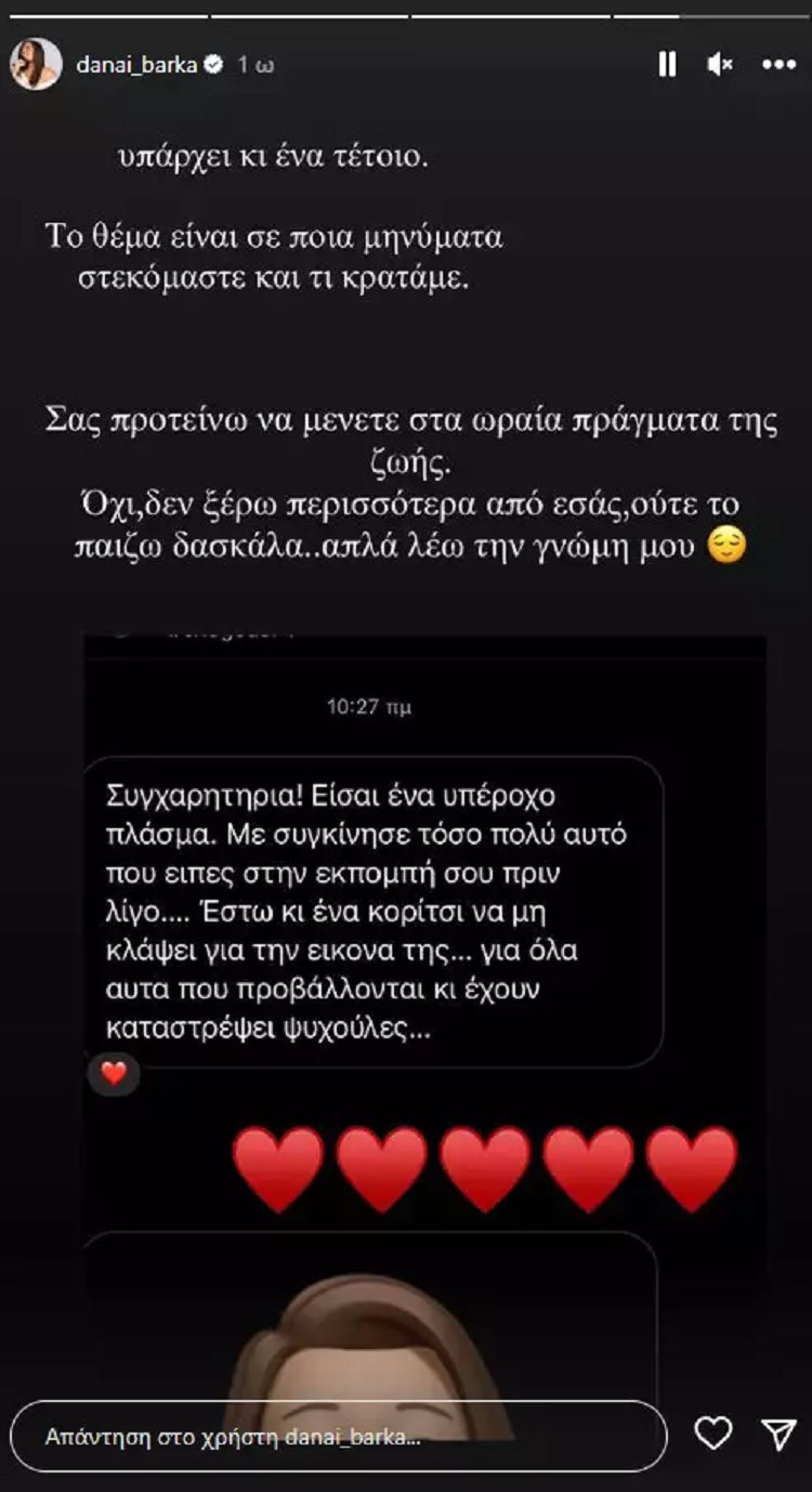 Στη συνέχεια προχώρησε και στη δημοσίευση κι ενός άλλου αισιόδοξου μηνύματος. «Για κάθε τέτοιο μήνυμα (σ.σ. υβριστικό) υπάρχει κι ένα τέτοιο. Το θέμα είναι σε ποια μηνύματα στεκόμαστε και τι κρατάμε. Σας προτείνω να μένετε σε ωραία πράγματα της ζωής. Όχι, δεν ξέρω περισσότερα από εσάς, ούτε παίζω δασκάλα… απλά λέω τη γνώμη μου», σημείωσε στο Instagram η Δανάη Μπάρκα.