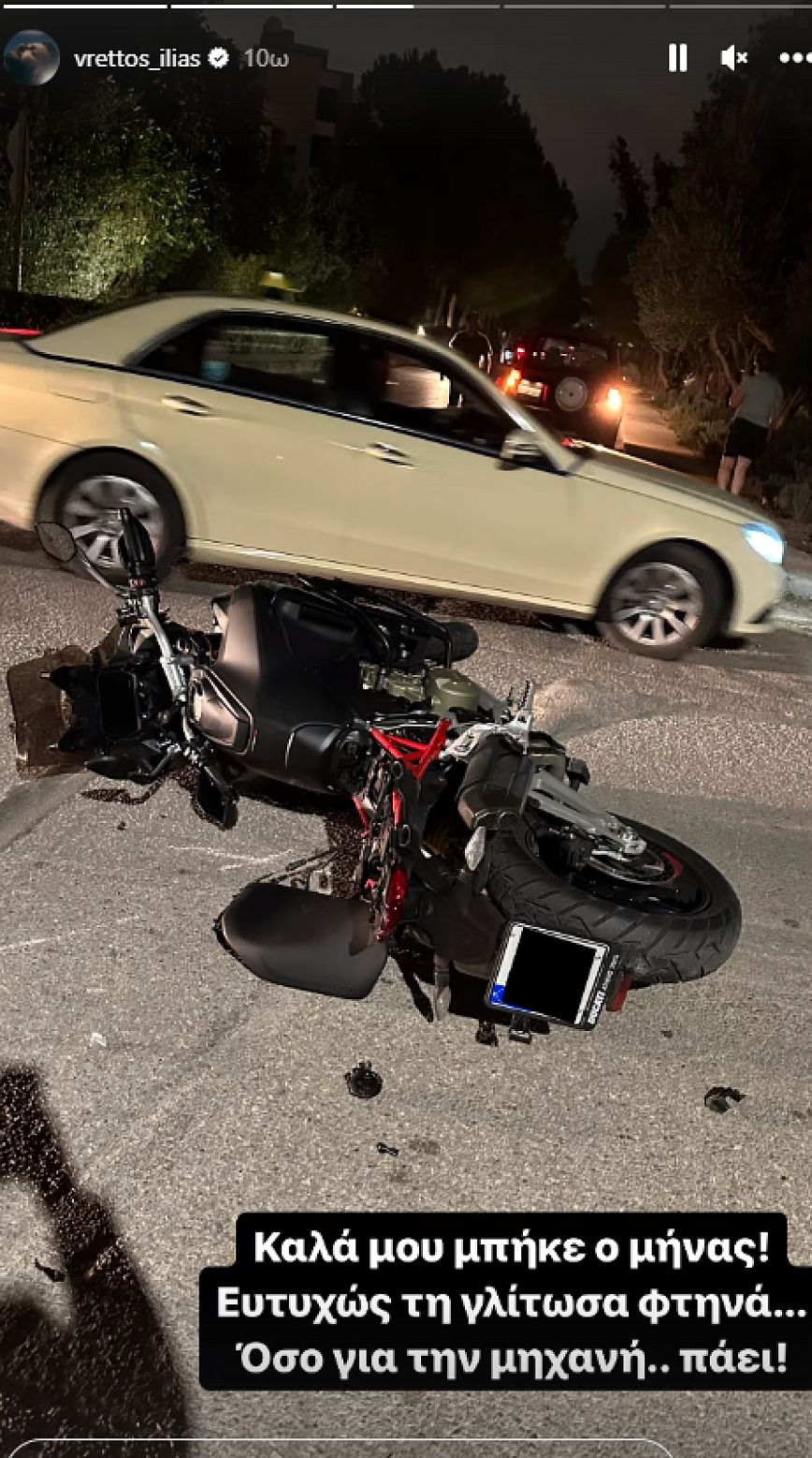 Μέσω Instagram, ο Ηλίας Βρεττός ανάρτησε μια φωτογραφία της μηχανής του μετά το συμβάν, ενώ με ένα σύντομο κλιπ ενημέρωσε τους ακολούθους τους, ότι: «Καταλαβαίνετε ότι είχα ένα τρακάρισμα αρκετά σοβαρό με τη μηχανή μου στη Γλυφάδα, ευτυχώς τη γλίτωσα φθηνά επειδή φορούσα κράνος. Είμαι καλά δεν συντρέχει λόγος ανησυχίας».