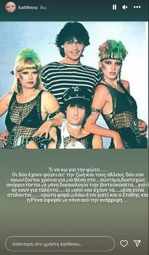 «Τι να πω για την φωτό… Οι δύο έχουν φύγει απ’ την ζωή και τους άλλους δύο που αγωνίζονται χρόνια για μια θέση στο… σύστημα, δυστυχώς απορρίπτονται με μόνη δικαιολογία τη βιντεοκασέτα… γιατί αν πουν για ταλέντο.. οι μισοί που έχουν τα μέσα είναι ατάλαντοι… πρώτη φορά μιλάω έτσι γιατί και ο Στάθης και η Ρένα έφυγαν με πόνο από την απόρριψη», έγραψε χαρακτηριστικά η Καίτη Φίνου, αφήνοντας σαφή υπονοούμενα.