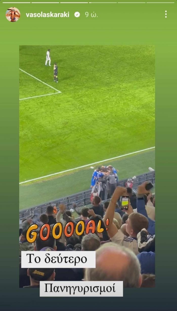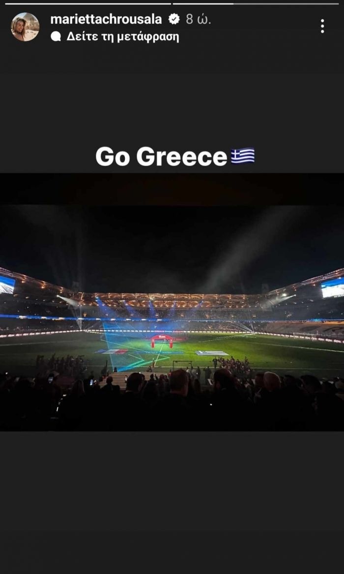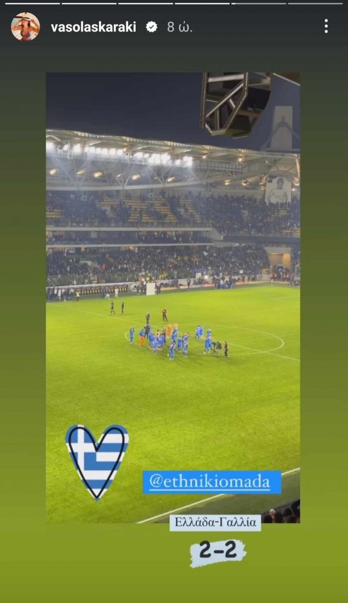 Η Σταματίνα Τσιμτσιλή, στο μεταξύ, ήταν μαζί με τα παιδιά της και κρατούσε μια ελληνική σημαία, ενώ η Βάσω Λασκαράκη ανέβαζε stories στο Instagram με τις σημαντικότερες φάσεις του ματς και τα γκολ. Παρέα της ήταν και η 10χρονη κόρη της Εύα.
