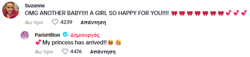 Πάνω στο μπλουζάκι ήταν γραμμένη η λέξη «London», ενώ υπήρχαν ένα ζευγάρι παιδικά κόκκινα γυαλιά ηλίου σε σχήμα καρδιάς και ένα αρκουδάκι. Λίγη ώρα αργότερα, σε σχόλιο της στο TikTok, διευκρίνισε ότι η κόρη της έχει ήδη γεννηθεί, γράφοντας: «Η πριγκίπισσα μου έφτασε!».