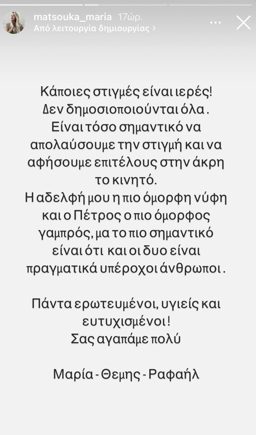 Η αδερφή μου, η πιο όμορφη νύφη και ο Πέτρος, ο πιο όμορφος γαμπρός, μα το πιο σημαντικό είναι ότι οι δυο είναι πραγματικά υπέροχοι άνθρωποι. Πάντα ερωτευμένοι, υγιείς και ευτυχισμένοι. Σας αγαπάμε πολύ, Μαρία – Θέμης- Ραφαήλ», έγραψε η Μαρία Ματσούκα.