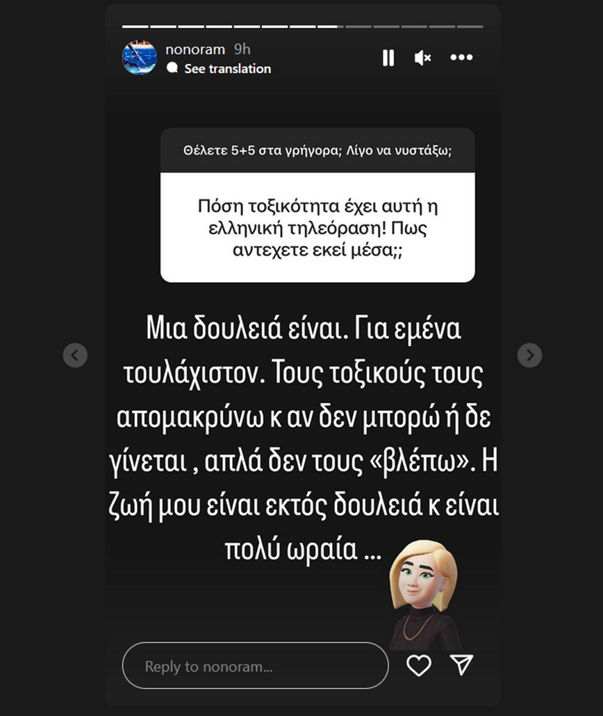 Έπειτα της έγινε και άλλη ερώτηση για την ελληνική τηλεόραση: «Πόση τοξικότητα έχει αυτή η ελληνική τηλεόραση; Πώς αντέχετε εκεί μέσα;». Και η Ελεονώρα Μελέτη απάντησε: «Μια δουλειά είναι, για εμένα τουλάχιστον. Τους τοξικούς τους απομακρύνω κι αν δεν μπορώ ή δεν γίνεται, απλά δεν τους “βλέπω”. Η ζωή μου είναι εκτός δουλειάς και είναι πολύ ωραία».