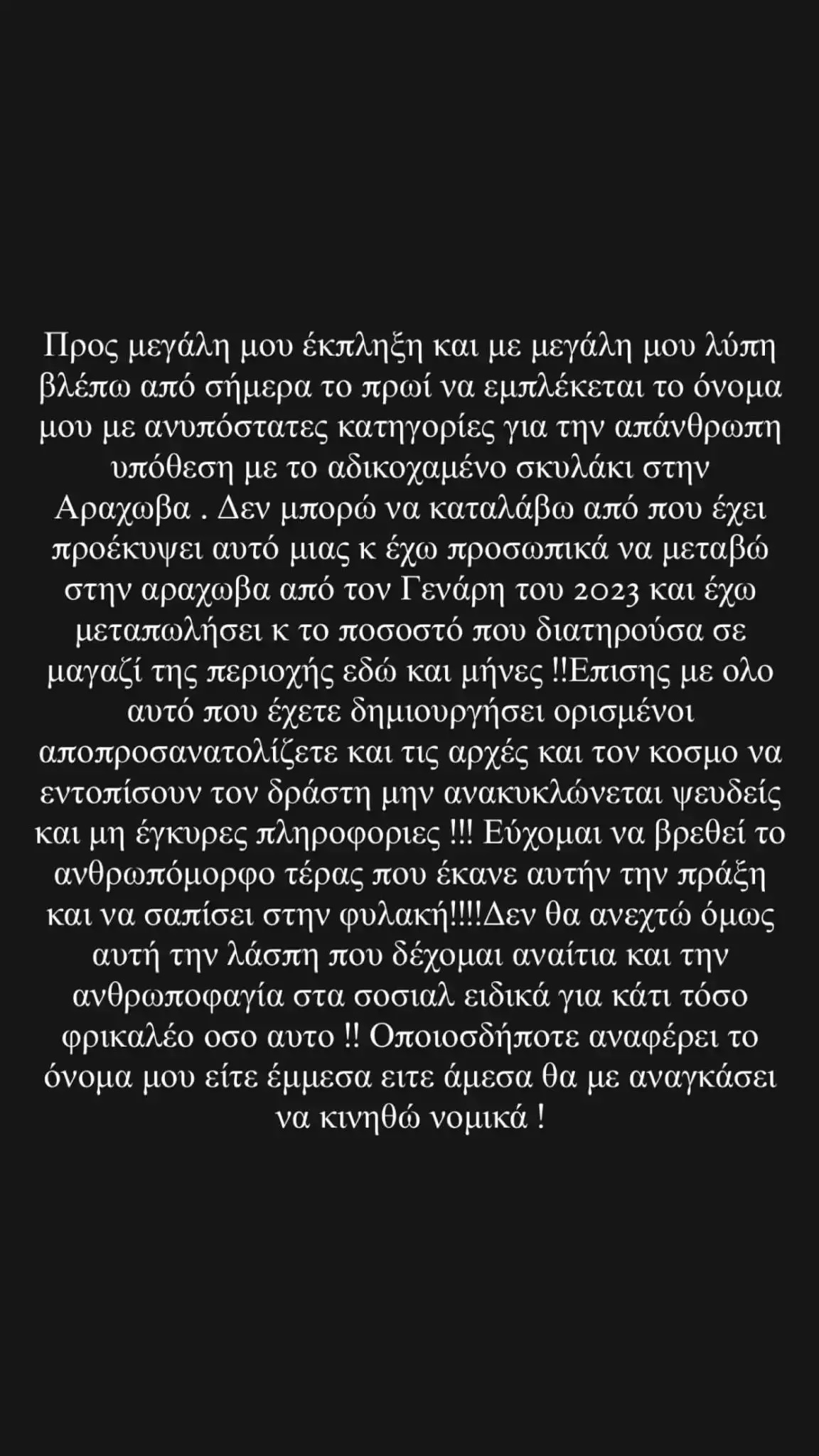 «Προς μεγάλη μου έκπληξη και με μεγάλη μου λύπη βλέπω από σήμερα το πρωί να εμπλέκεται το όνομά μου με ανυπόστατες κατηγορίες για την απάνθρωπη υπόθεση με το αδικοχαμένο σκυλάκι στην Αράχωβα. Δε μπορώ να καταλάβω από πού έχει προκύψει αυτό, μιας κι εγώ προσωπικά έχω να μεταβώ στην Αράχωβα από τον Γενάρη του 2023 και έχω μεταπωλήσει και το ποσοστό που διατηρούσα σε μαγαζί της περιοχής εδώ και μήνες. Επίσης, με όλο αυτό που έχετε δημιουργήσει ορισμένοι, αποπροσανατολίζετε και τις Αρχές και τον κόσμο να εντοπίσουν τον δράστη.