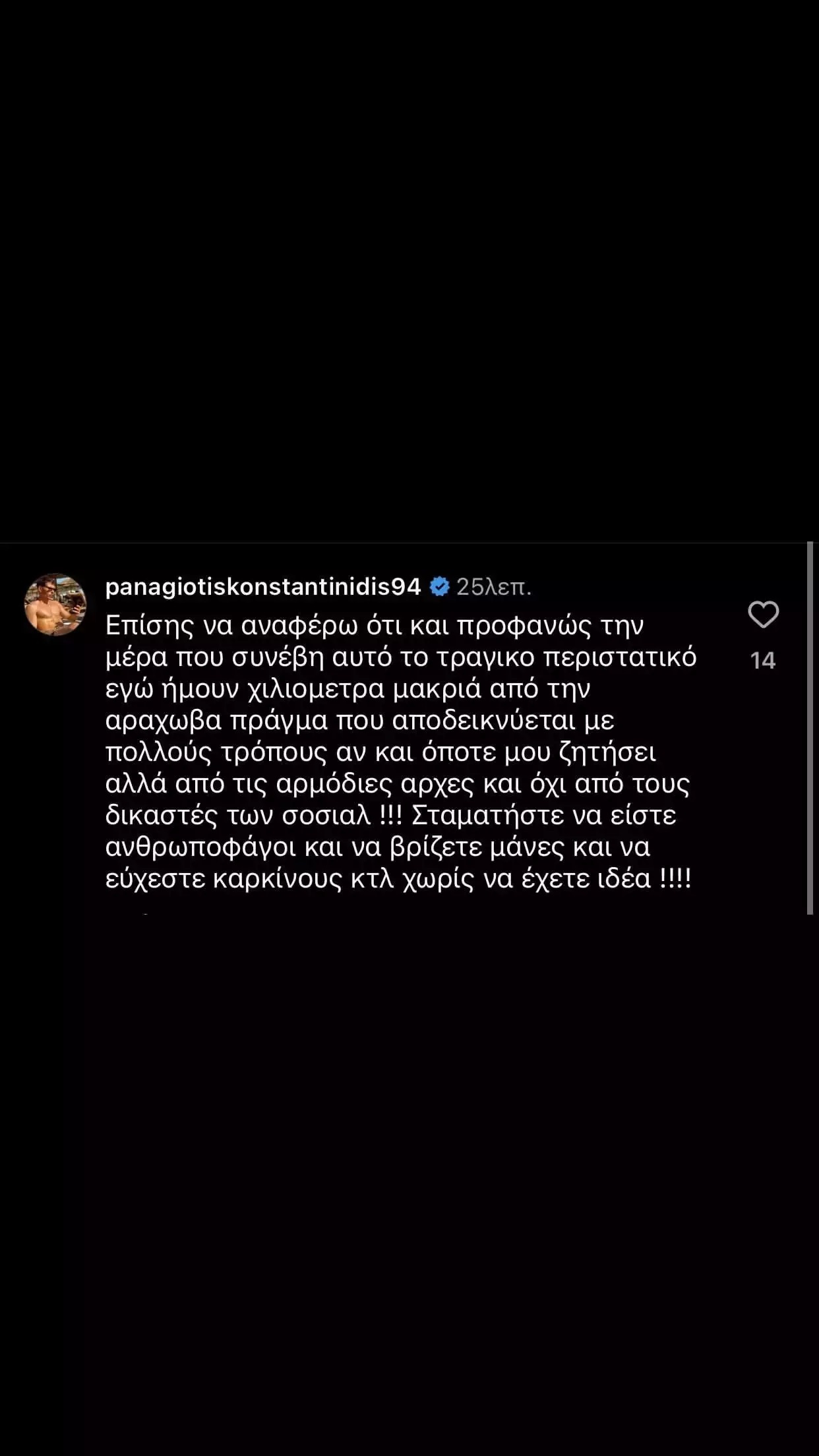 «Επίσης να αναφέρω ότι προφανώς τη μέρα που συνέβη αυτό το τραγικό γεγονός, εγώ ήμουν χιλιόμετρα μακριά από την Αράχωβα, πράγμα που αποδεικνύεται από πολλούς τρόπους αν και όποτε μου ζητηθεί, αλλά από τις αρμόδιες αρχές και όχι από τους δικαστές των social. Σταματήστε να είστε ανθρωποφάγοι, να βρίζετε μάνες και να εύχεστε καρκίνους χωρίς να έχετε ιδέα».