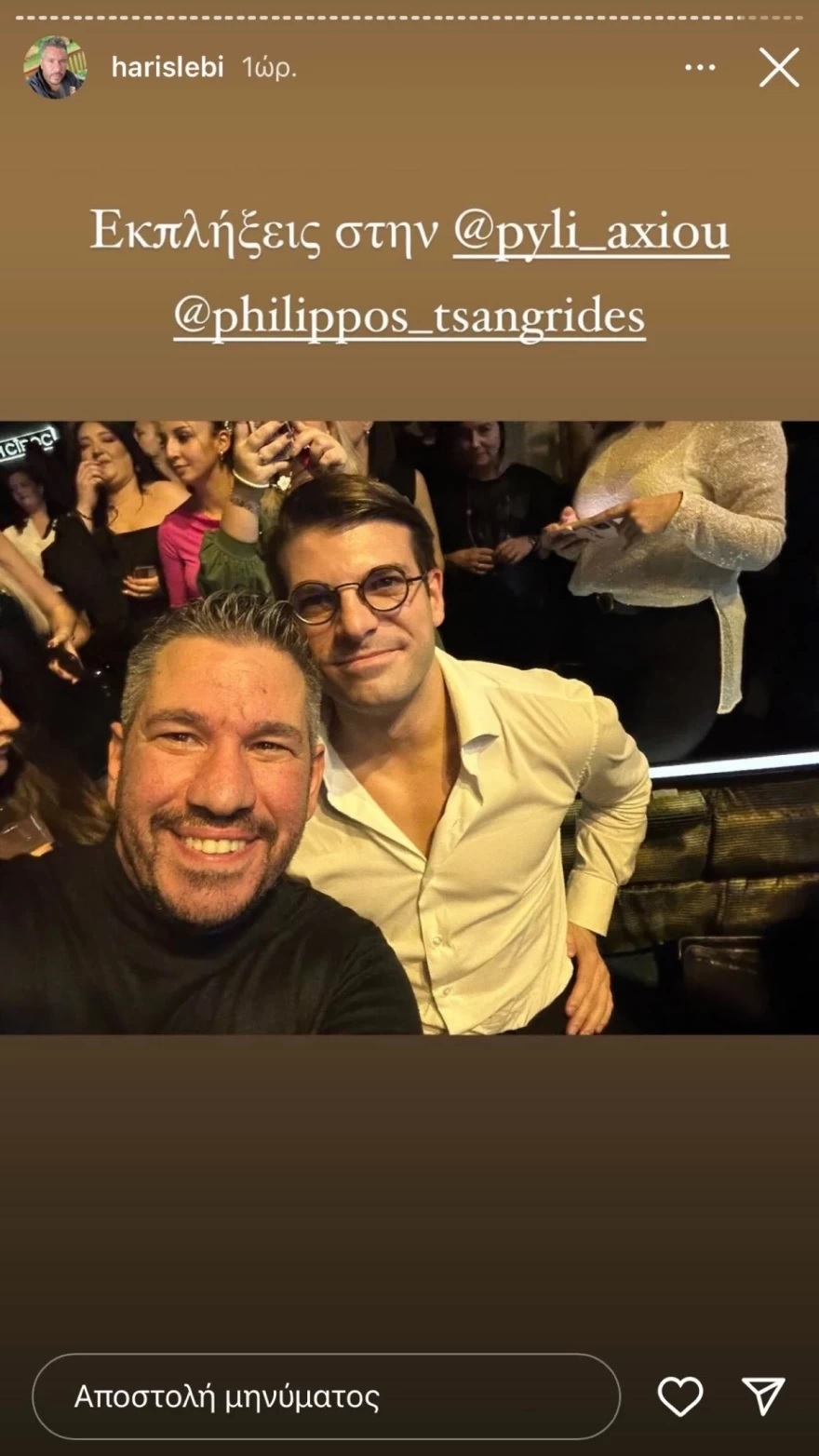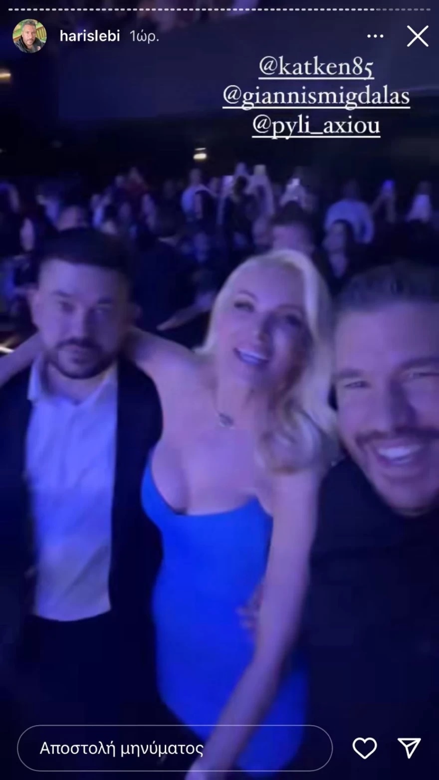 Ο πρώην συνεργάτης της, Χάρης Λεμπιδάκης, κοινοποίησε ένα στιγμιότυπο μαζί της στο Instagram, αλλά και ένα με τον πρώην σύντροφο της Κατερίνας Καινούργιου, Φίλιππο Τσαγκρίδη, ο οποίος βρισκόταν, επίσης, στη Θεσσαλονίκη και διασκέδασε στο ίδιο νυχτερινό κέντρο, στο οποίο εμφανίζεται ο τραγουδιστής.