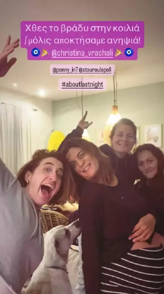 Η Δανάη Λουκάκη «πόσταρε» στο Instagram μια φωτογραφία που είχαν τραβήξει το βράδυ της Τρίτης 19/12, στο σπίτι της Χριστίνας Βραχάλη μαζί με δύο ακόμα φίλες τους κι έγραψε: «Χθες το βράδυ στην κοιλιά, μόλις αποκτήσαμε ανιψιά».