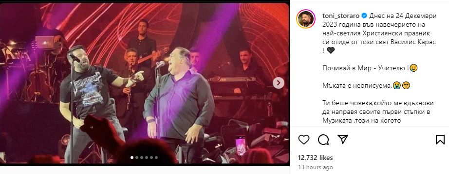 «Σήμερα (σ.σ. χθες), 24 Δεκεμβρίου 2023, παραμονή της πιο λαμπερής χριστιανικής γιορτής, έφυγε από τον κόσμο ο Βασίλης Καρράς. Αναπαύσου εν ειρήνη δάσκαλε! Ο πόνος είναι απερίγραπτος.