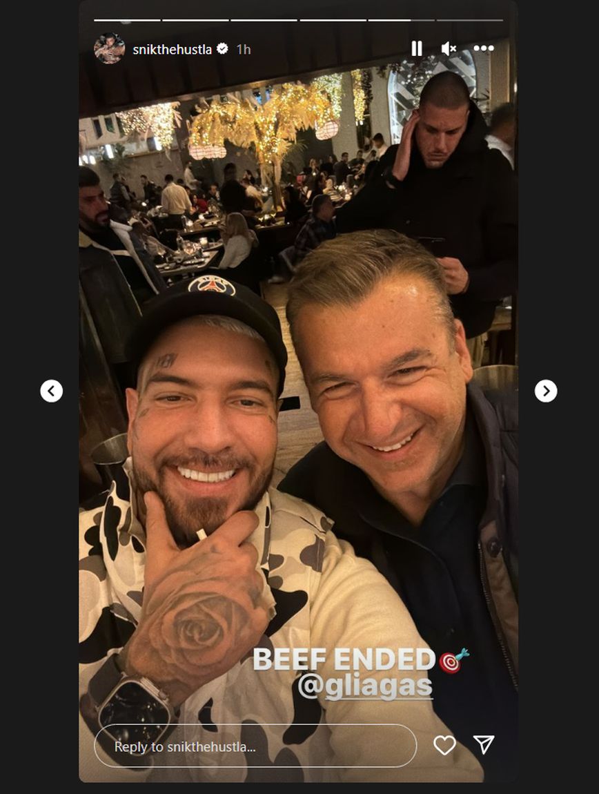 Στο παρελθόν φαίνεται να ανήκουν οι διαφορές που είχαν ο Snik με τον Γιώργο Λιάγκα και επισφράγισαν τέλος του… beef τους με μια κοινή φωτογραφία. Snik και Γιώργος Λιάγκας βρέθηκαν σε κοινό τραπέζι και δεν παρέλειψαν να ποζάρουν χαμογελαστοί δίπλα – δίπλα.