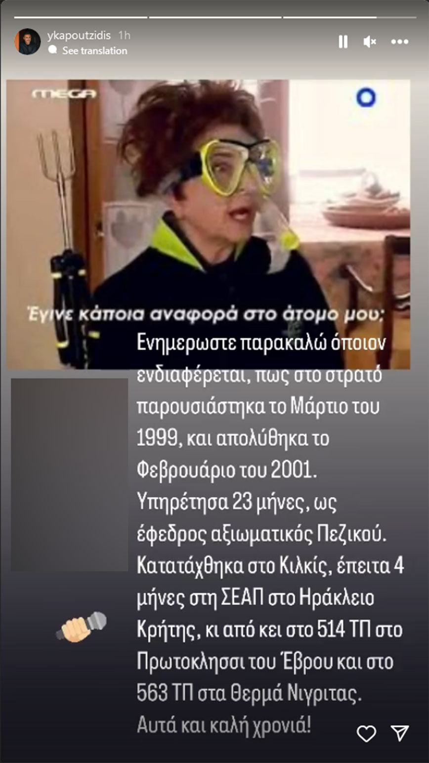 Με φόντο μια φωτογραφία της «Θεοπούλας», του χαρακτήρα που υποδύθηκε η ηθοποιός Έφη Παπαθεοδώρου στη σειρά «Παρά Πέντε», o Γιώργος Καπουτζίδης αναφέρθηκε στη στρατιωτική του θητεία στις Ένοπλες Δυνάμεις.