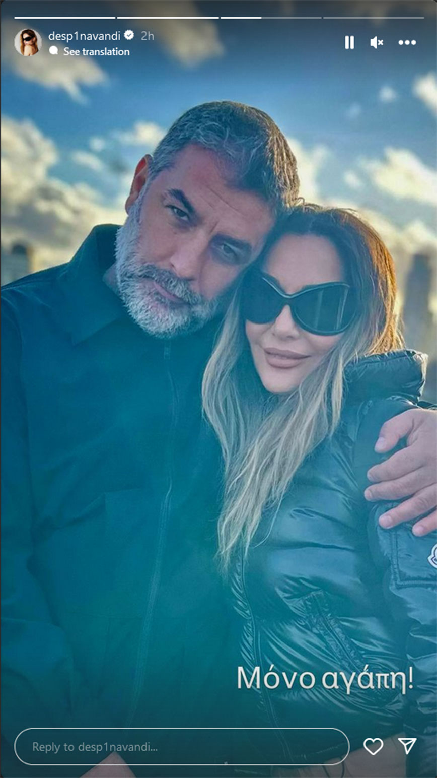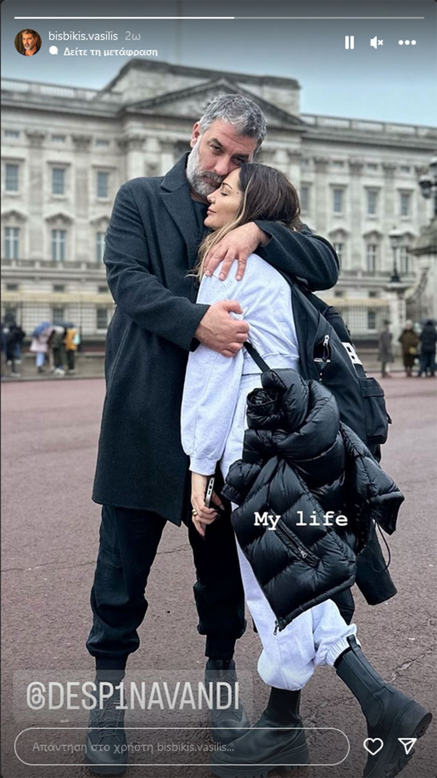 Αγκαλιασμένοι στις εικόνες ο Βασίλης Μπισμπίκης και η Δέσποινα Βανδή έγραψαν όμορφα λόγια ο ένας για τον άλλον. Σ’ εκείνη που πόσταρε ο ηθοποιός σημείωσε: «My Life», δηλαδή «η ζωή μου», ενώ η τραγουδίστρια σ’ εκείνη που δημοσίευσε η ίδια, τόνισε: «Μόνο Αγάπη».