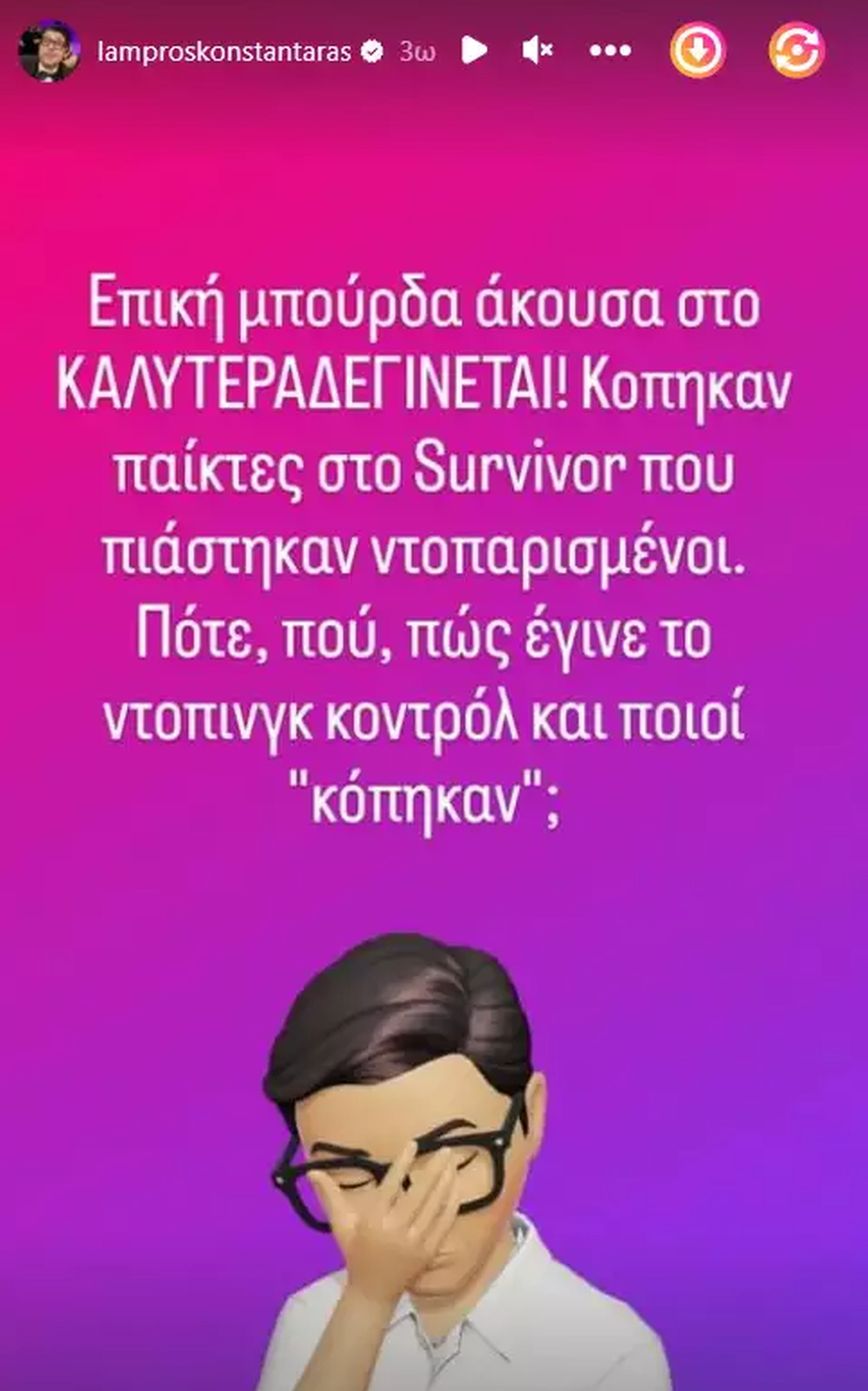 Αφορμή για αυτή την τοποθέτηση του δημοσιογράφου στάθηκαν τα σχόλια της τηλεοπτικής παρέας για το Survivor και το νέο κύκλο του ριάλιτι επιβίωσης που έρχεται προσεχώς στους τηλεοπτικούς μας δέκτες. Έτσι, μέσα από μια ιστορία που δημοσίευσε στο προφίλ του, ο Λάμπρος Κωνσταντάρας θέλησε να εκφράσει τα εξής.