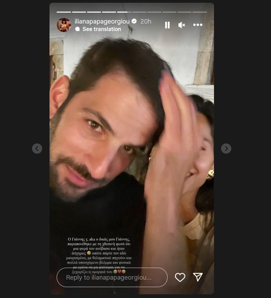 «Ο Γιάννης, ο δικός μου Γιάννης, παραπονέθηκε με τη χθεσινή φώτο ότι μια φορά τον ανέβασα και ήταν άσχημος. Οπότε πάρτε τον εδώ μαυρισμένο, με θεληματικό πηγούνι και πολλά υποσχόμενο βλέμμα και φυσικά με εμένα να μη φαίνομαι, για να ξεχωρίζει η ομορφιά του», ανέφερε χαρακτηριστικά στο στιγμιότυπο που πόσταρε.